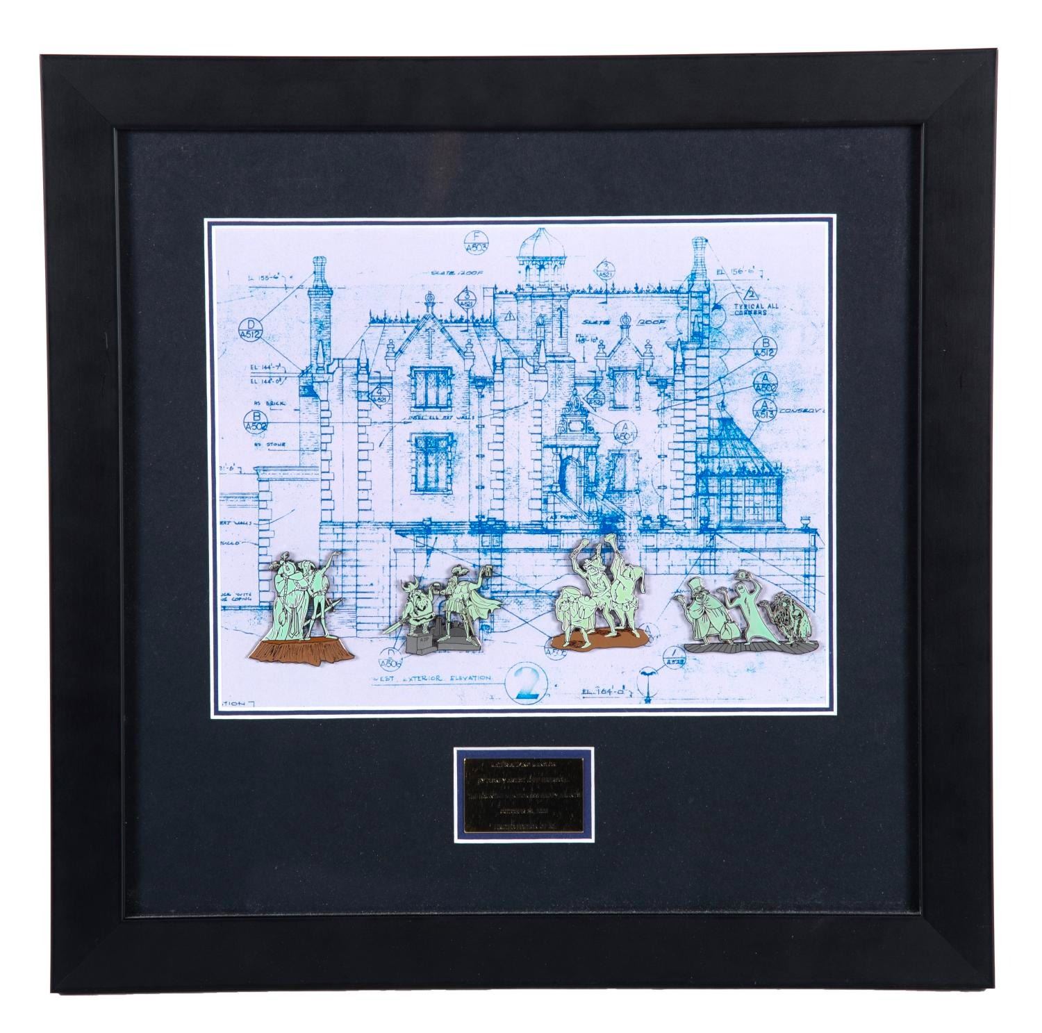(Walt Disney World, 2003) A “Materializing Mansion” Framed (4) Pin Set. This set was produced in a limited edition of 50 and designed by Disney Artist Jeff Ebersohl for “The Haunted Mansion 999 Happy Haunts” event on October 29, 2003. This pin set features the Opera Singers, Graveyard band, Hitchhiking Ghosts, and Knight & Viking with a background print depicting a West Exterior Elevation of The Haunted Mansion at The Magic Kingdom. Measuring 15.75”x15.5”, this framed piece is in a fine condition.