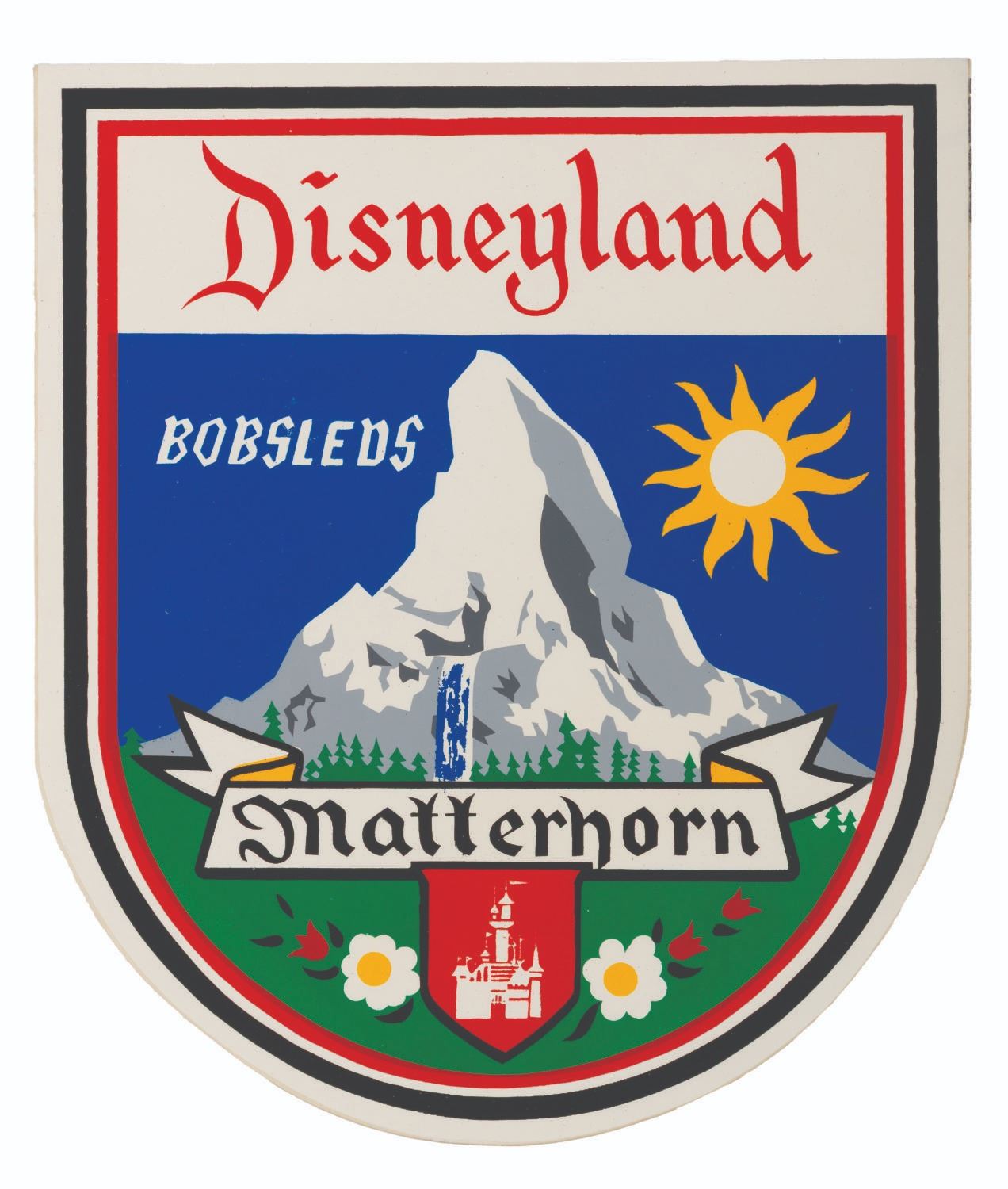 (Disneyland, 1970s-80s) An unused vehicle decal from the Matterhorn Bobsleds attraction. These decals can be seen on the front of the bobsleds, and similar examples are still in use today. Measuring 7" x 8", the decal is in very good condition with very slight wear from age.