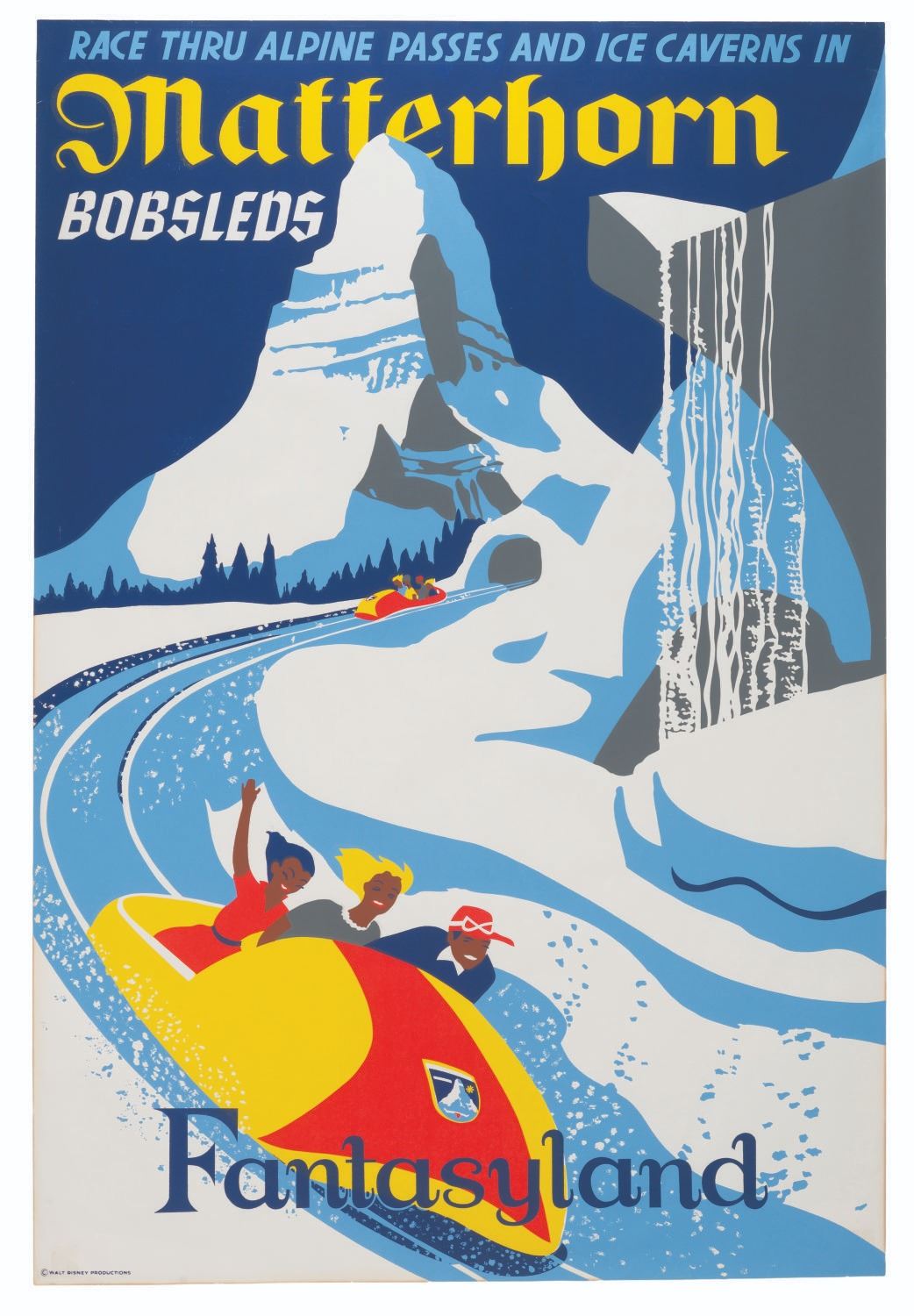 (Disneyland, 1959) A hand-silkscreened attraction poster for Disneyland's Matterhorn Bobsleds. Designed by Paul Hartley, the great sense of movement and color choices used in this poster have made it a favorite among collectors since the attraction opened in 1959. Measuring 36" x 54", the poster displays in good condition with discoloration along the edges, edge wear, edge tears up to 0.5", scratches, creases, paper loss, and adhesives on the corners of the reverse, visible through the front.