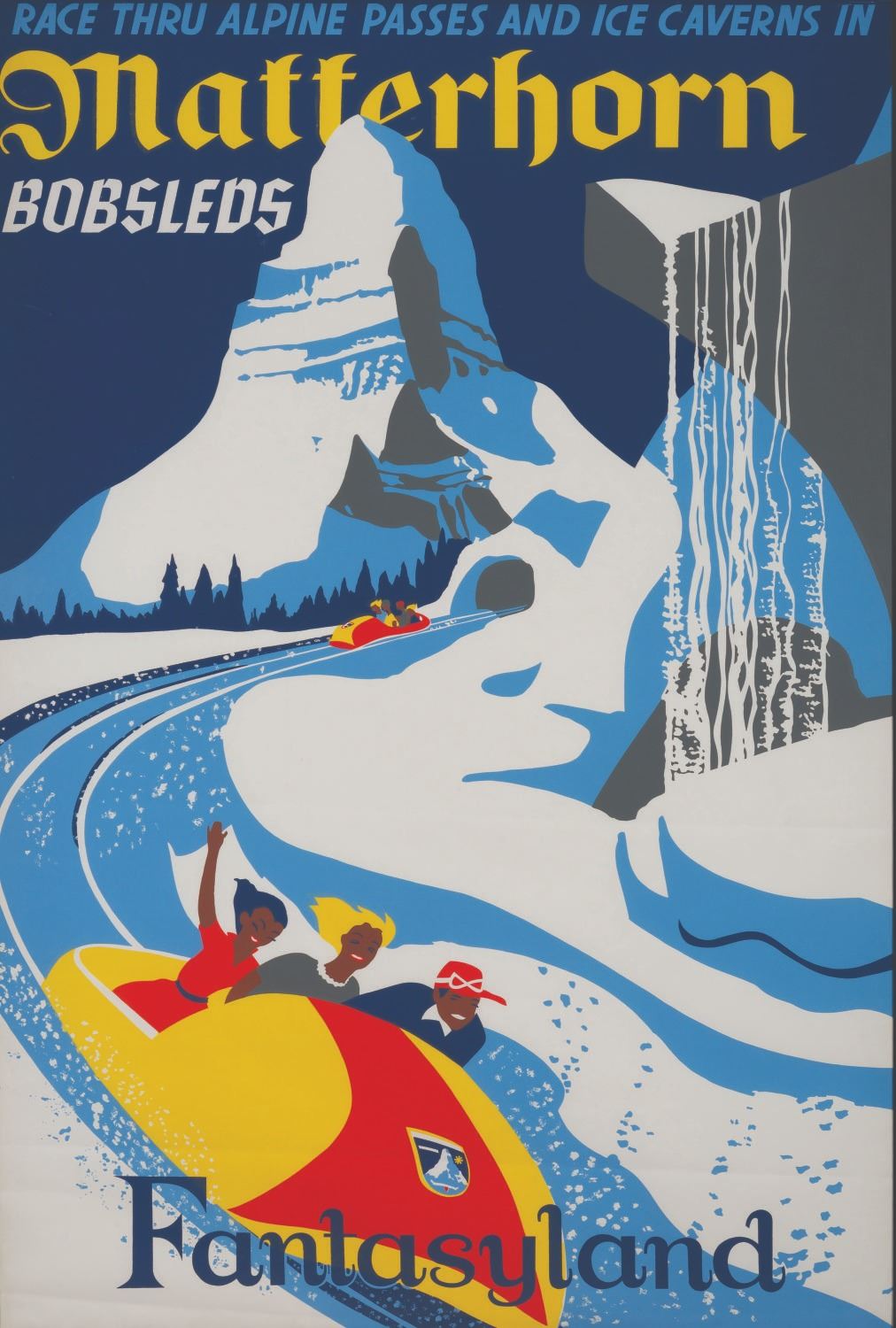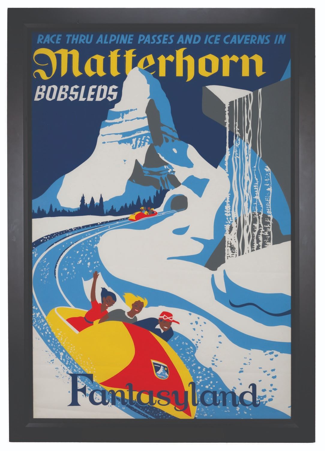 (Disneyland, 1959) A hand-silkscreened attraction poster for Disneyland's Matterhorn Bobsleds. Designed by Paul Hartley, the great sense of movement and color choices used in this poster have made it a favorite among collectors since the attraction opened in 1959. Measuring 36" x 54" in a 41" x 59" glassless frame, the poster displays in good condition with heavy creases and scratches. The poster was folded up to 1" on each side, hiding the Disney copyright and tip of the bobsled, and punctured with brads all around, which is not viewable from the front.