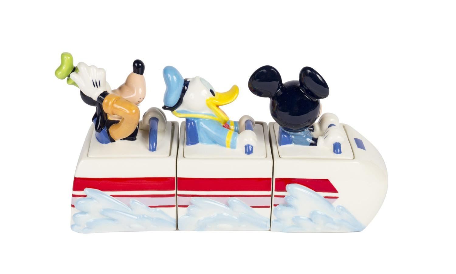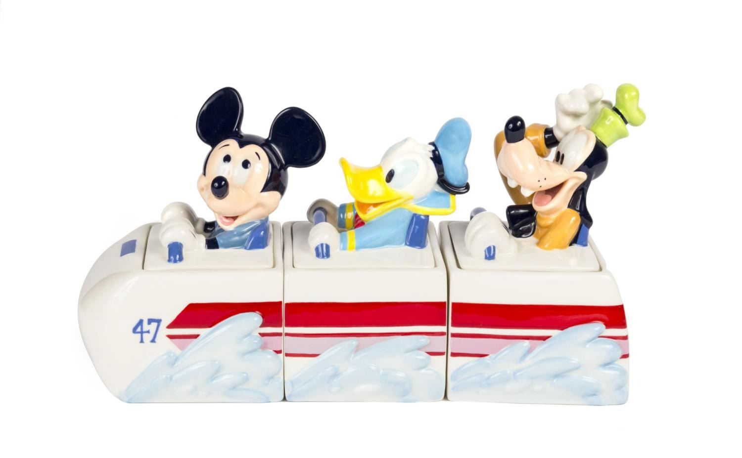 (Disneyland, 2009) A set of three cookie jars commemorating the 50th anniversary of the Matterhorn Bobsleds with figural lids of Mickey, Donald, and Goofy. Ranging in size from 8” x 5.25” x 5” deep to 9” x 4.75” x 5” deep, the ceramic jars are in fine condition.