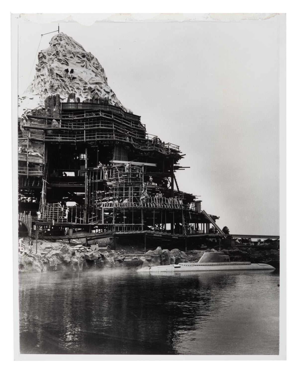 (Disneyland, 1959) A large photo of Disneyland’s Matterhorn under construction, seen from the Submarine Lagoon. The detailed print clearly shows construction workers at work on the attraction. Measuring 11" x 14", the print displays in good condition with a strip of paper loss along the top, mainly in the plain border.