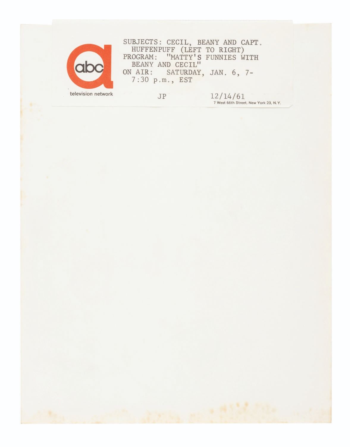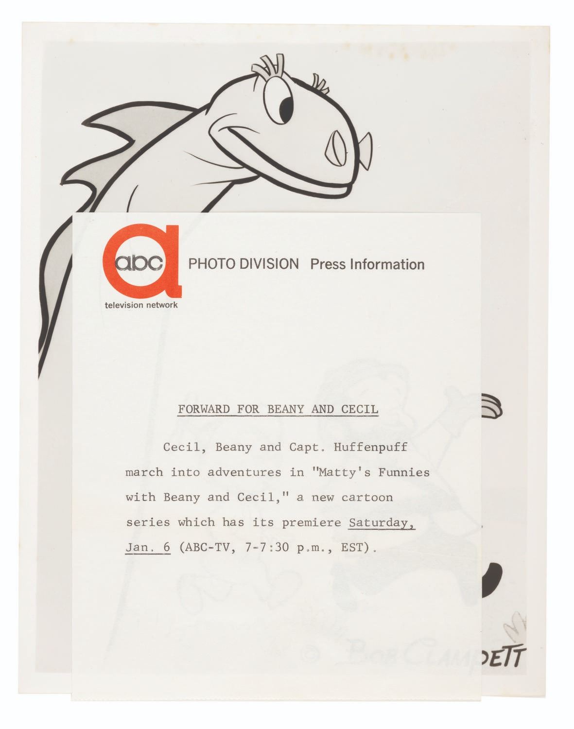 (ABC, 1961) A press photo with an attached caption sheet for “Matty’s Funnies With Beany and Cecil” including Captain Huffenpuff. Measuring 7” x 9”, the photo and caption are in very good condition, with slight discoloration along the top of the photo.
