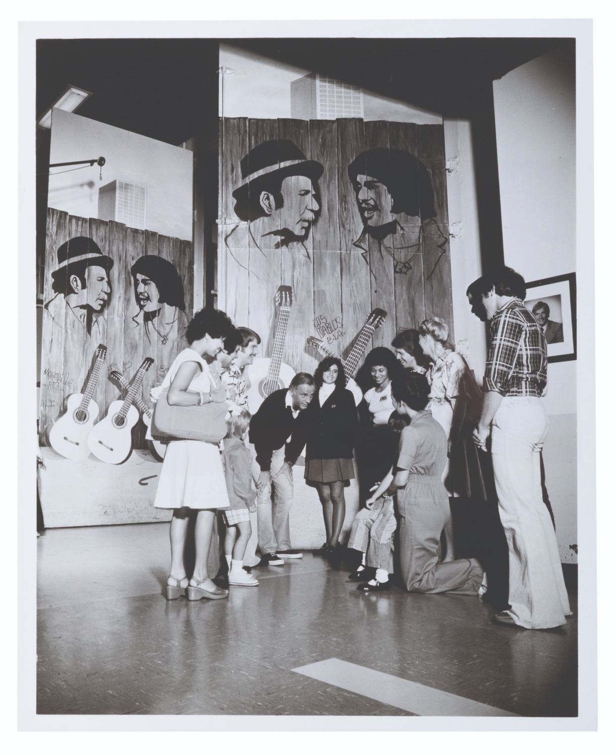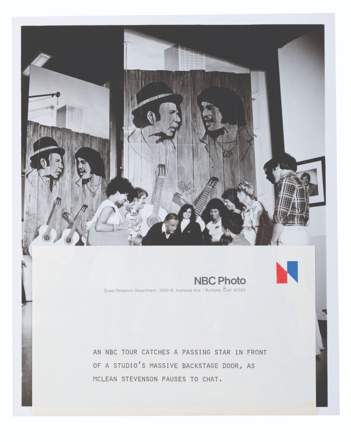 (NBC, 1970s) A publicity photograph of M*A*S*H star McLean Stevenson visiting with guests at NBC Studios, beneath some artwork of "Chico and the Man." Measuring 8" x 10", the photograph is in very good condition with light edge wear and discoloration to the reverse. Included is the original caption sheet.