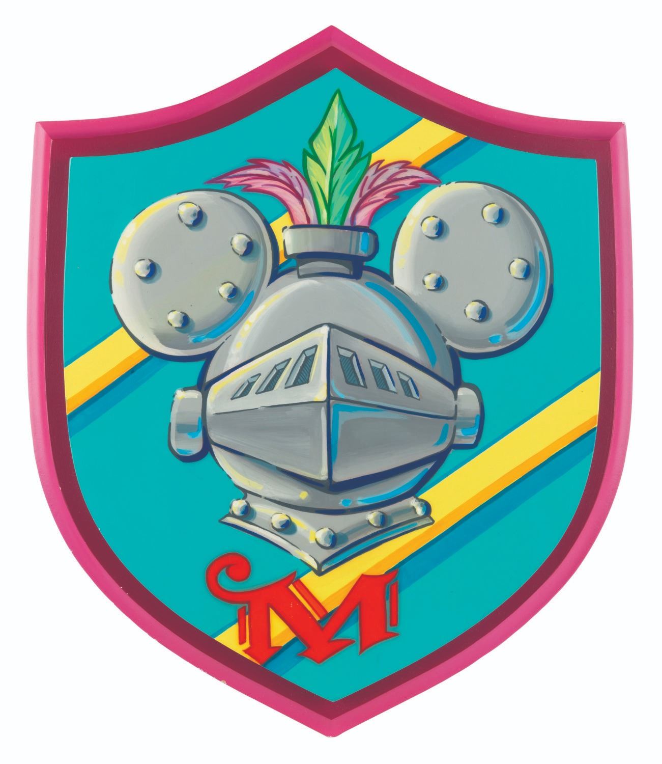 (Disney, 1990s-2000s) A Royal Crest-themed hand-painted Disney Store display featuring Mickey as a knight. Measuring 15” x 18” and 2” thick, the plaque displays in very good condition with scratches, wear, inscriptions on the reverse, and spots of paint loss.