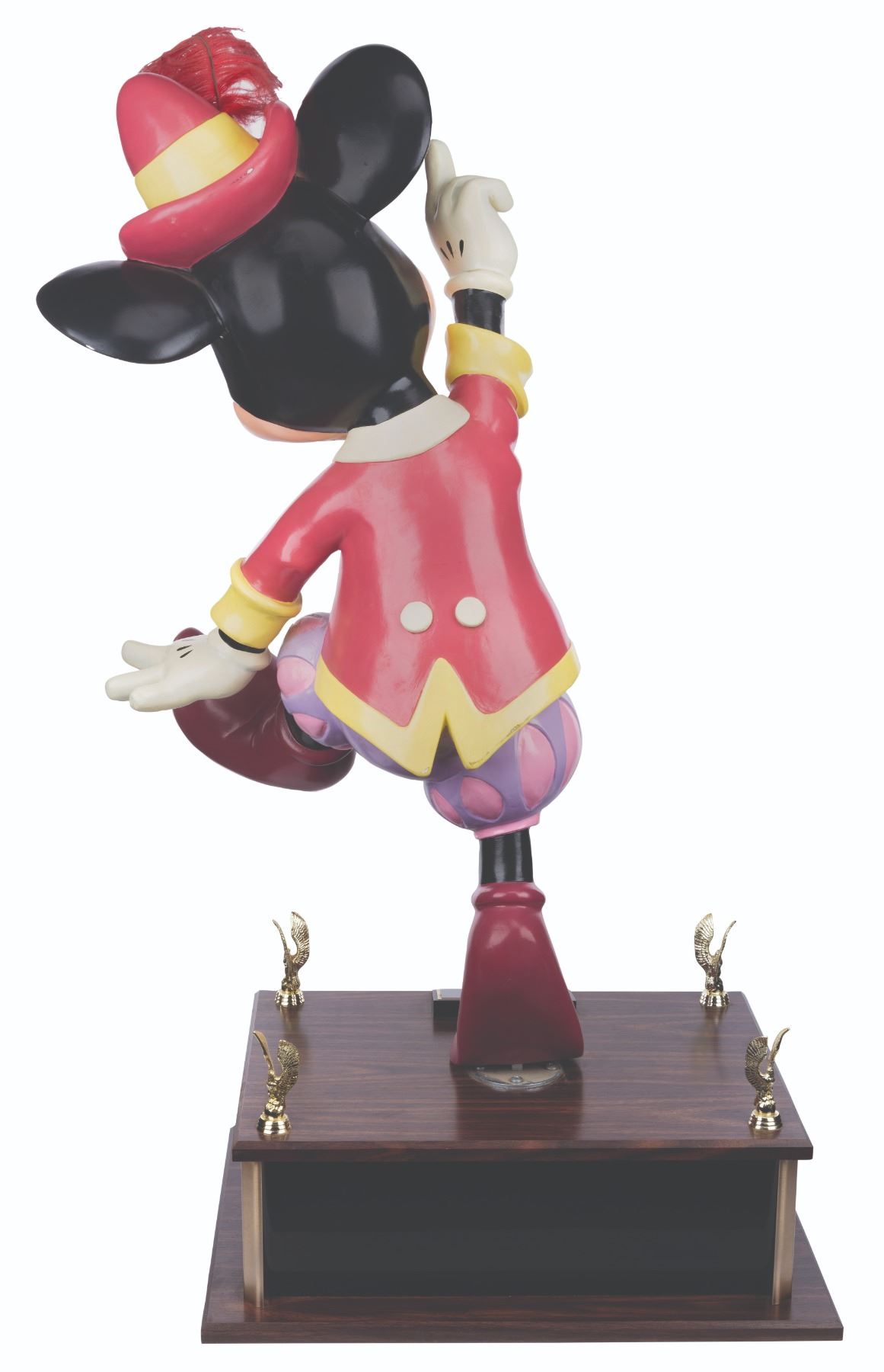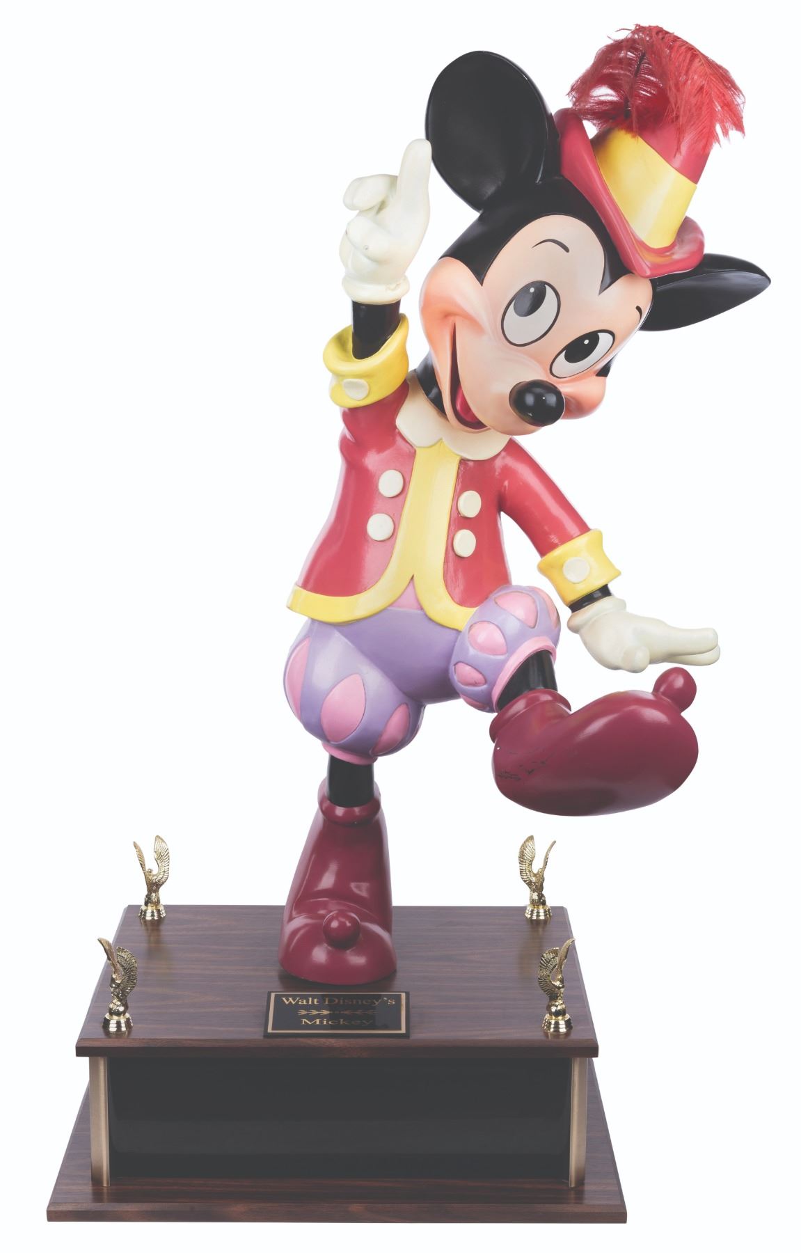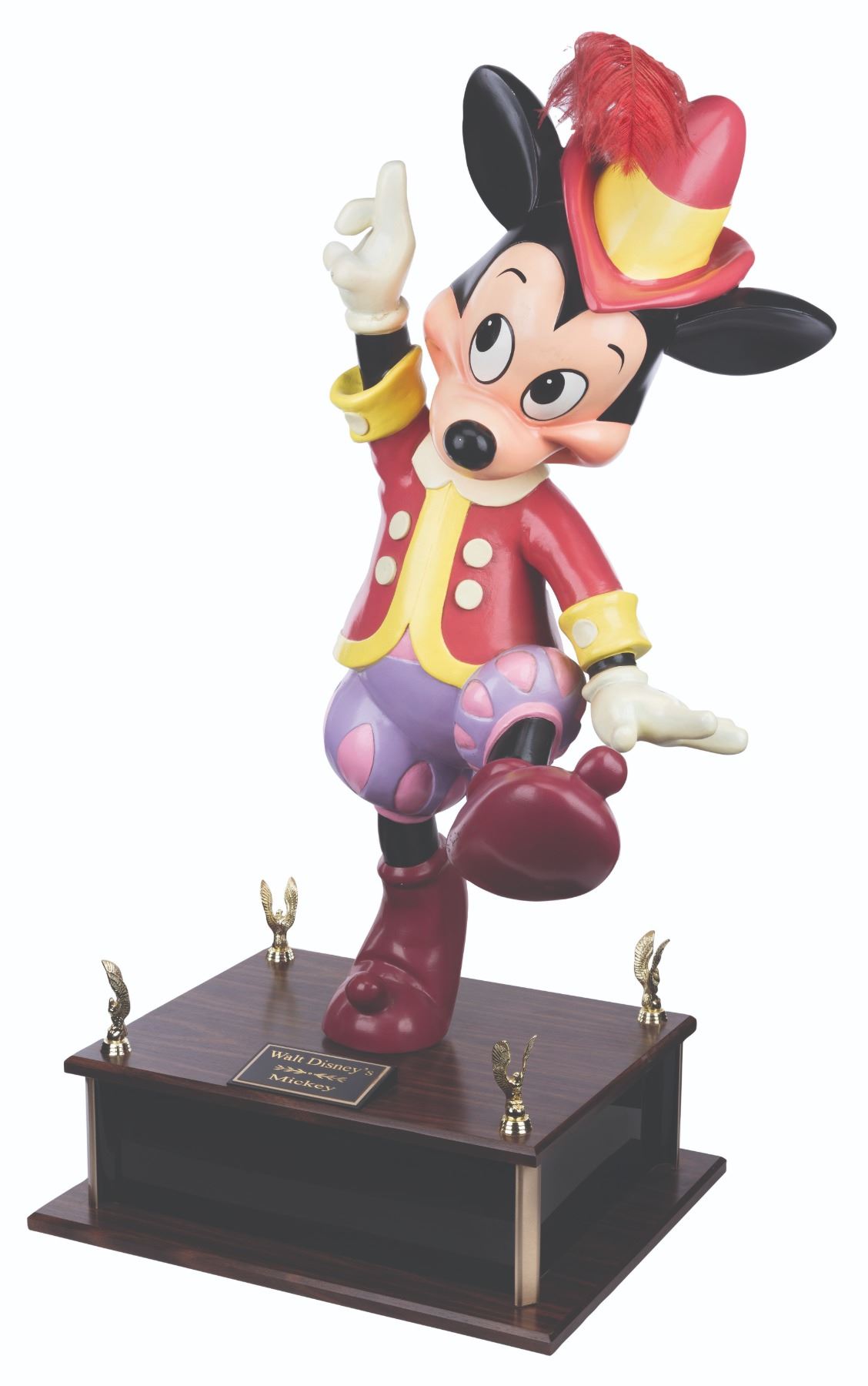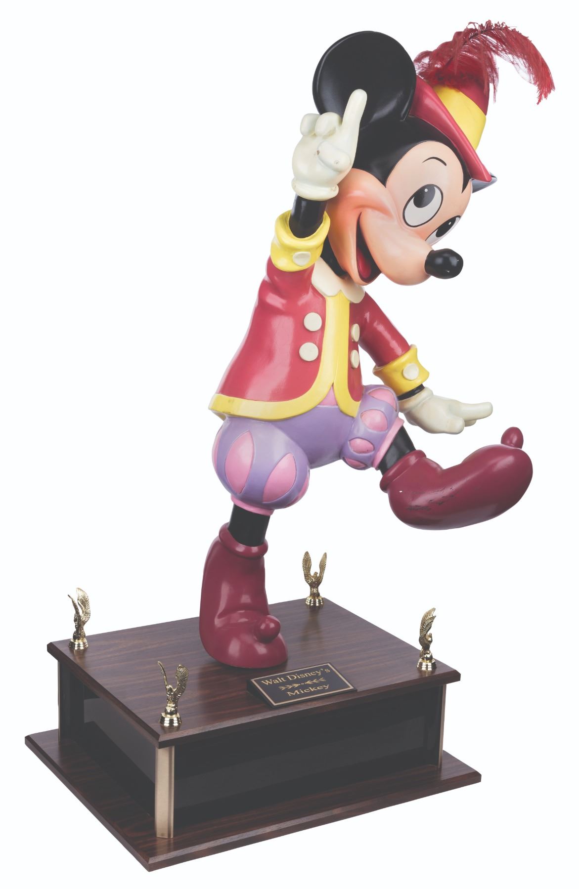 (Disney, 1987-2000s) An original Disney Store Mickey Mouse display figure. This Mickey was part of a scene titled “Mickey’s Magical Music Shoppe” which featured beloved Disney characters in medieval attire playing instruments. Measuring 15” x 17” x 40” tall on a 20” x 7” x 16” deep custom base for a full height of 40”, the fiberglass figure displays in very good condition with heavy scuffs on the foot, discoloration on the hands, scuffs, scratches, stains, and a 1.5” crack in the neck. Due to size and weight, this item will require special shipping arrangements. Please inquire before bidding.