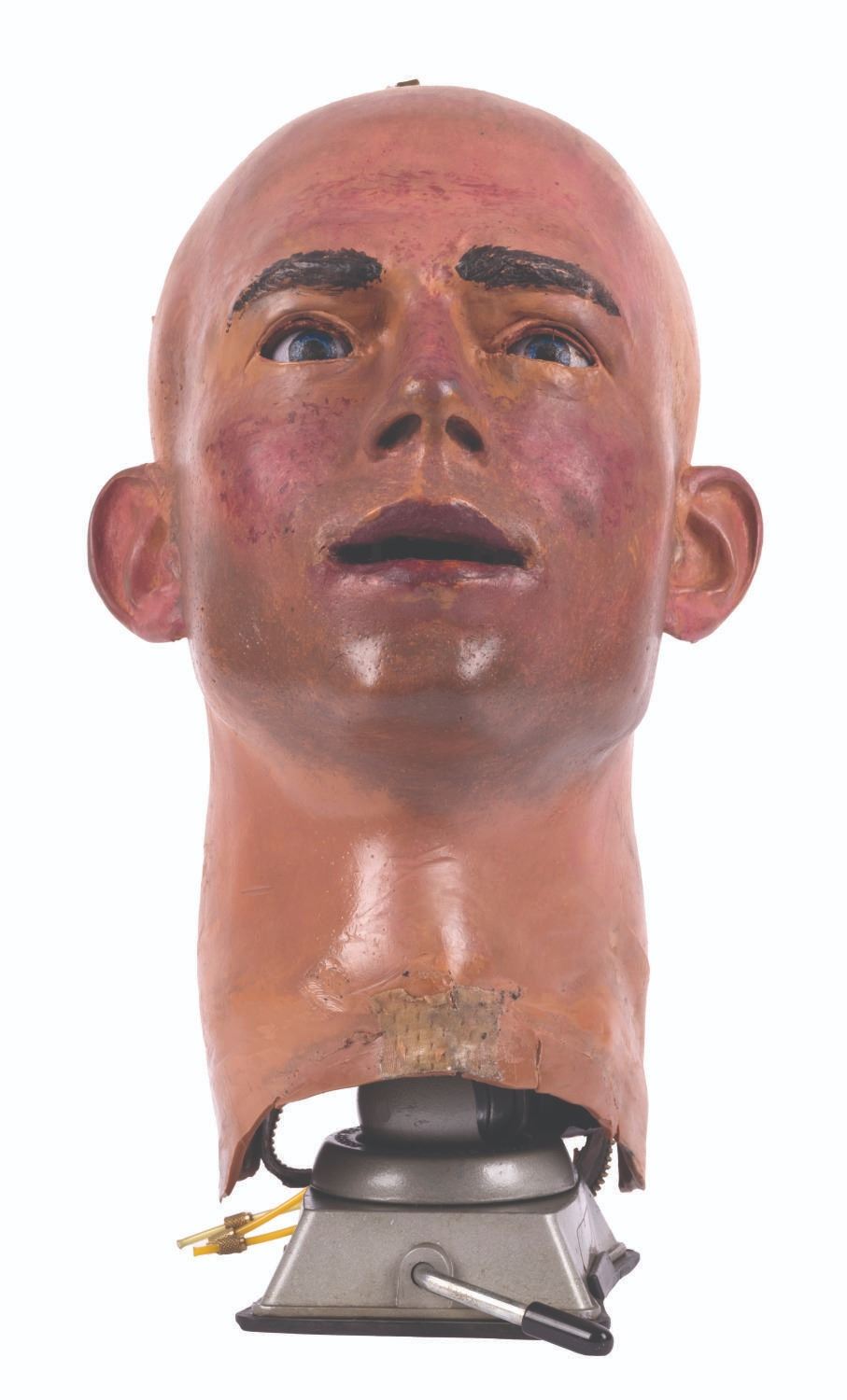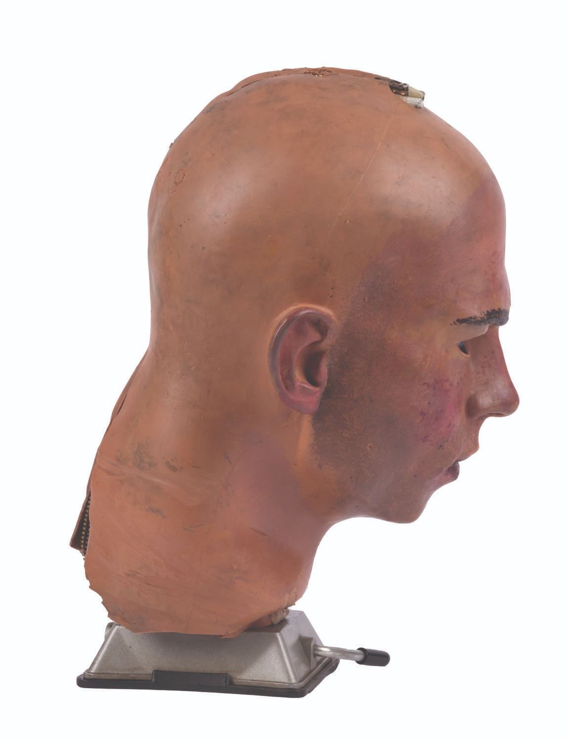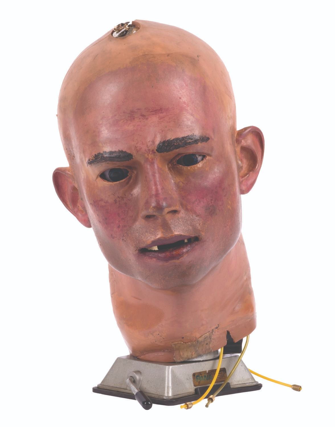 (Tokyo Disneyland, 1983) An original Audio-Animatronics head from the Meet the World main show or its "Electro Home" post-show. This piece is a fantastic example of a 1970s Audio-Animatronics head and jaw assembly, retaining its original interior frame and electronic components, butyrate plastic shell, and hand-painted, flexible latex skin carrying a "USA - 9" location code impression. Measuring 12" tall and 8"x8", the head is mounted for display, achieving a total height of 14.5". The head is in very good condition exhibiting scratches, scuffs, and wear from its original installation, handling, and age of its materials.