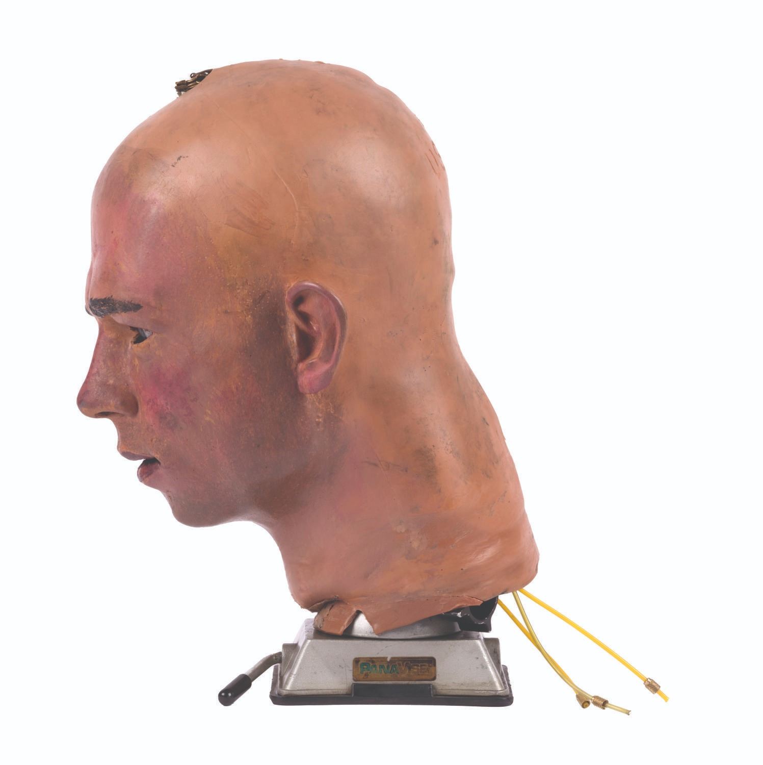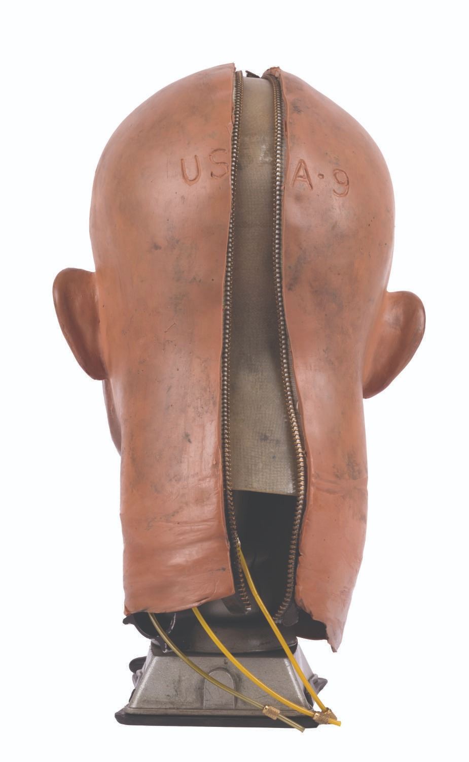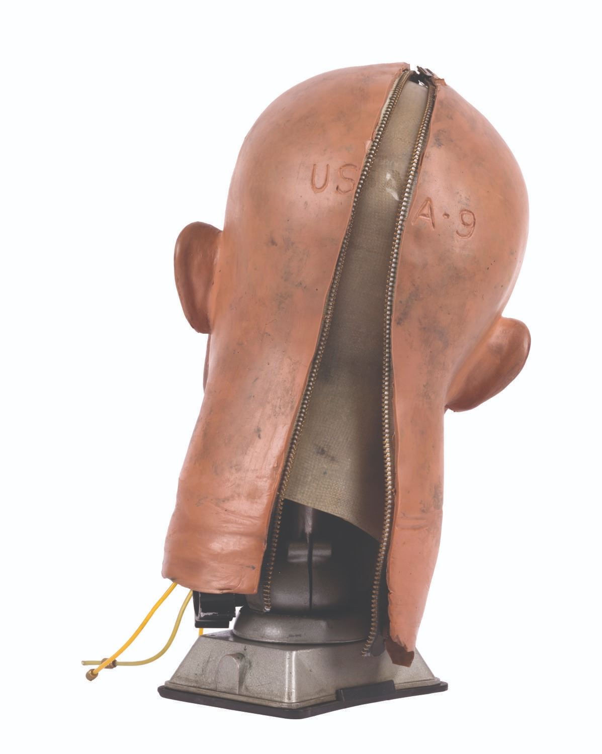 (Tokyo Disneyland, 1983) An original Audio-Animatronics head from the Meet the World main show or its "Electro Home" post-show. This piece is a fantastic example of a 1970s Audio-Animatronics head and jaw assembly, retaining its original interior frame and electronic components, butyrate plastic shell, and hand-painted, flexible latex skin carrying a "USA - 9" location code impression. Measuring 12" tall and 8"x8", the head is mounted for display, achieving a total height of 14.5". The head is in very good condition exhibiting scratches, scuffs, and wear from its original installation, handling, and age of its materials.