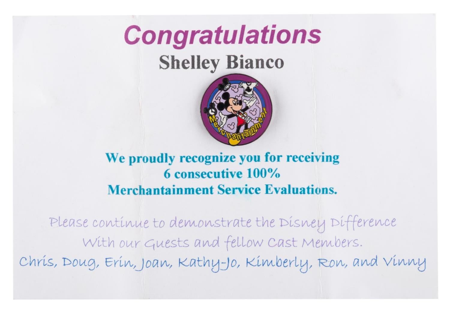 (Disney, 1990s) A very rare Cast Member Merchtainment Award pin given for receiving six consecutive 100% service evaluations. The 1" pin is in fine condition, attached to its fair condition 4" x 6" card with heavy folds.