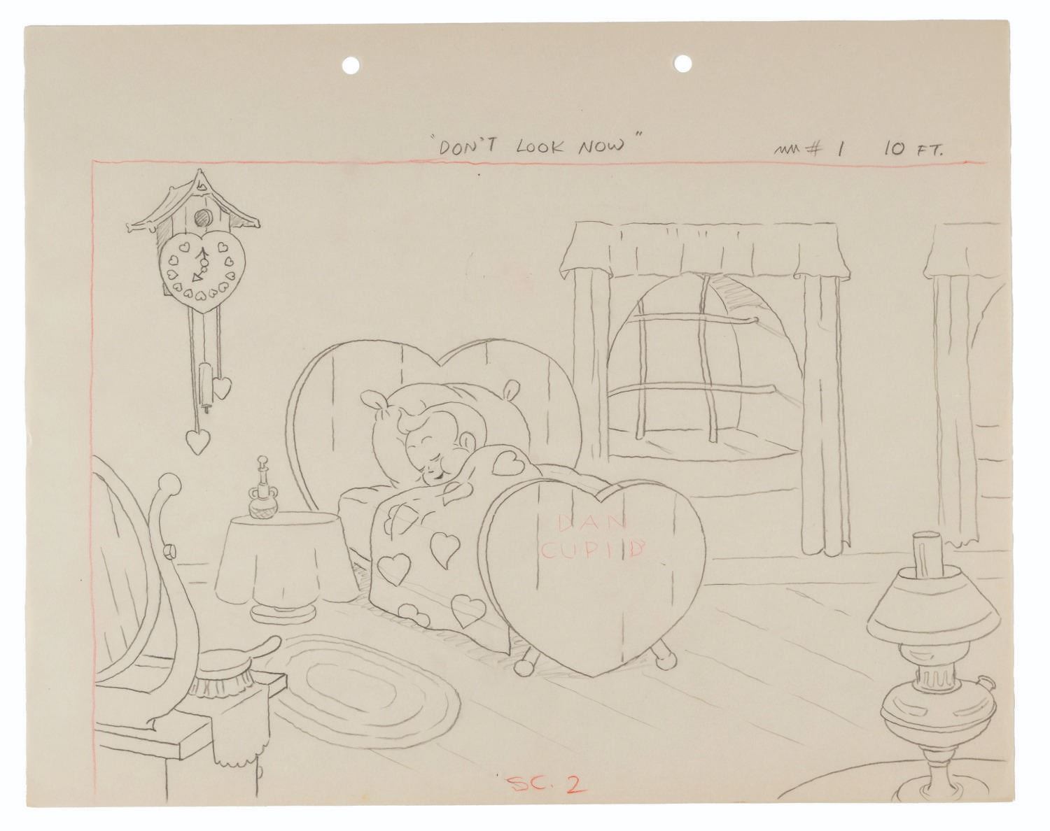 (Schlesinger, 1936) A layout drawing of Dan Cupid in his home from the Merrie Melodies cartoon “Don’t Look Now.” With an image size of 7.75” x 11” on 9.5” x 12” animation paper, the drawing accomplished in graphite and red pencil is in very good condition with light wear from production use, and slight discoloration from age.