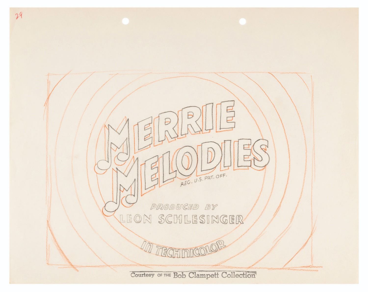 (Schlesinger, 1943) An original “Merrie Melodies” title card layout drawing. The Merrie Melodies series introduced many of the most popular cartoon characters of all time, including Bugs Bunny, Porky Pig, and Tweety Bird. This design was used from 1942 to 1944, with this particular layout created for the Merrie Melodies short “An Itch in Time,” directed by Bob Clampett. The cartoon’s original title art and film elements are lost, and this drawing is believed to be one of the only two surviving pieces of production title art for the short, the other being the “Warner Bros. Present” title card drawing featured in the next lot. Measuring 9.5” x 12” overall, the graphite and colored pencil drawing displays in fine condition, stamped “Courtesy of the Bob Clampett Collection,” with light discoloration from age.