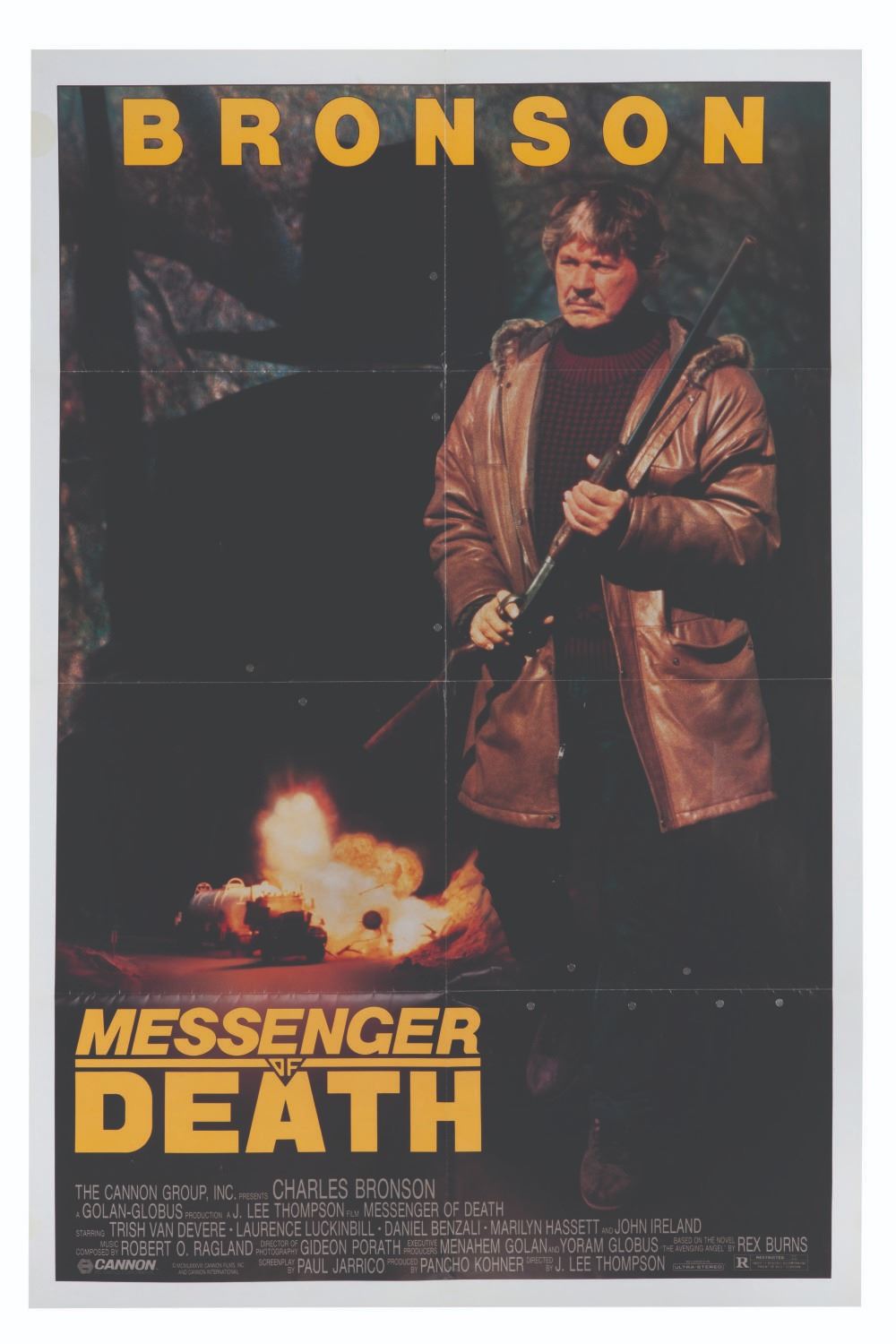 (Cannon, 1988) A One-Sheet poster for Charles Bronson's Messenger of Death. Measuring 27"x41", the poster is in good condition, with wear along original fold lines.