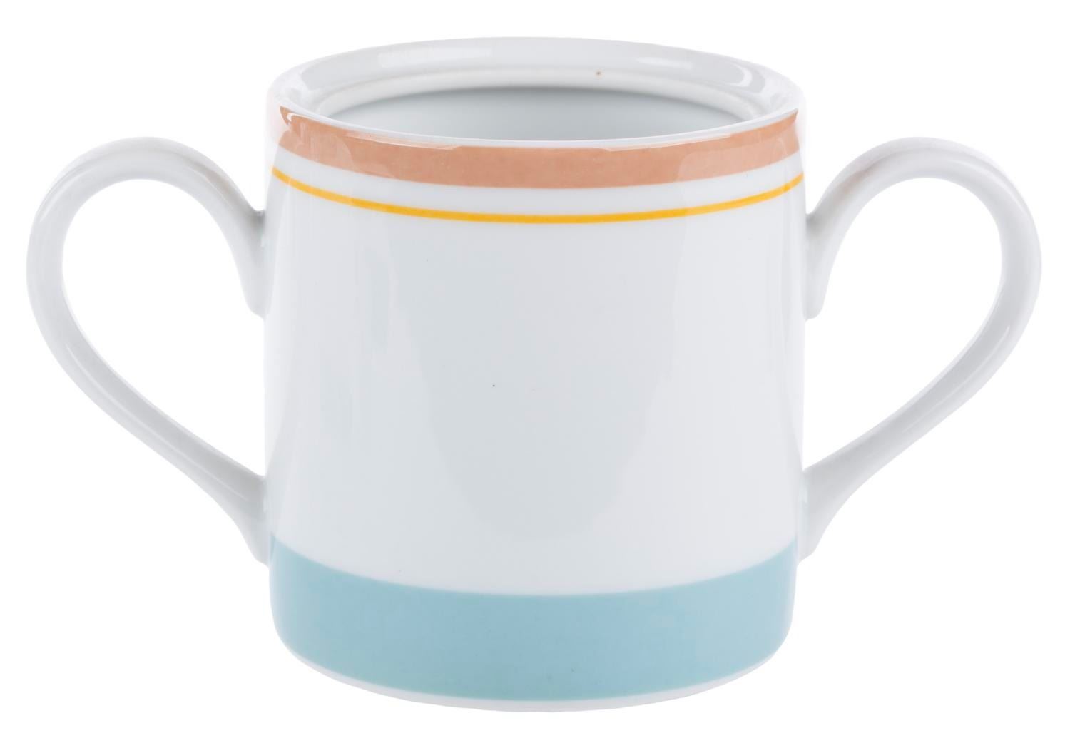 (Disney, 1990s) A replica Disney Studio Executive Dining Room Sugar Bowl. Architect Michael Graves designed this pattern for the Walt Disney Studio's Team Disney Building in Burbank. This pattern was available for purchase at the short-lived Walt Disney Galleries store in Santa Ana during the 1990s. Measuring 3” x 6” x 3” high, the sugar bowl is in fine condition, missing the lid.