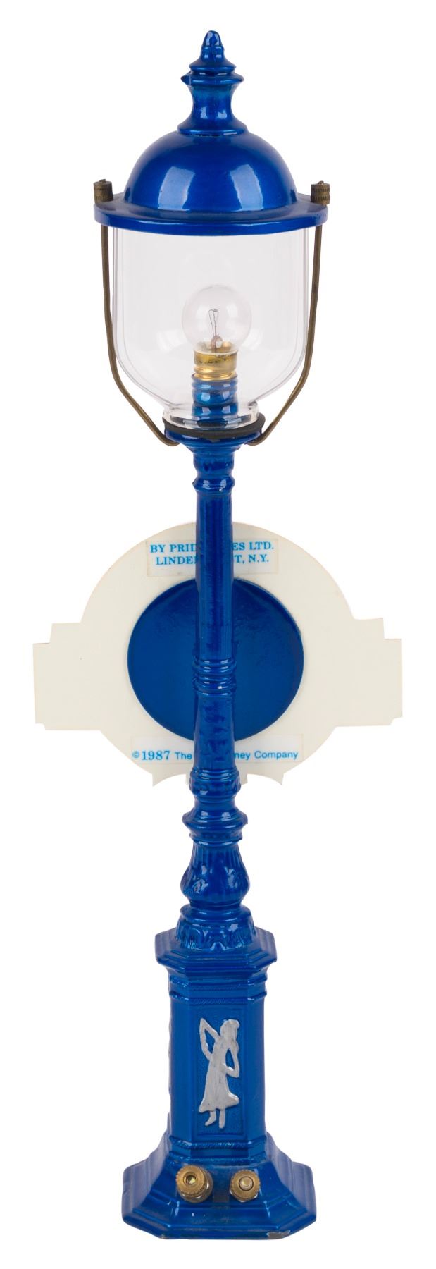 (Pride Lines, 1990s) A rare miniature Mickey 60th Anniversary commemorative street lamp manufactured by Pride Lines and compatible with Lionel trains. Measuring approximately 10.25" tall, the metallic "O" gauge lamp displayed and tested in fine working condition, with slight repair to the sign.