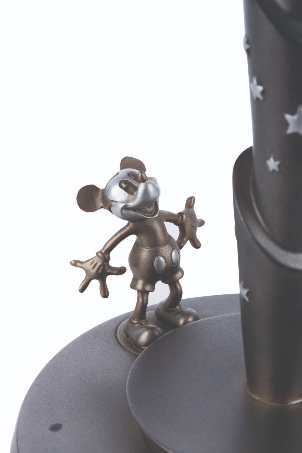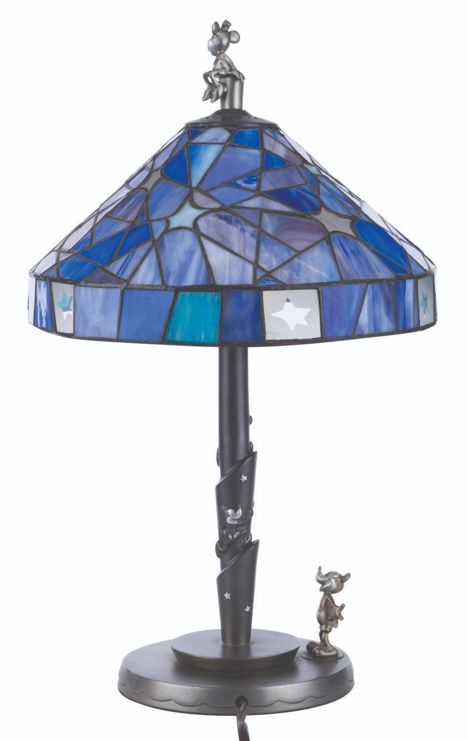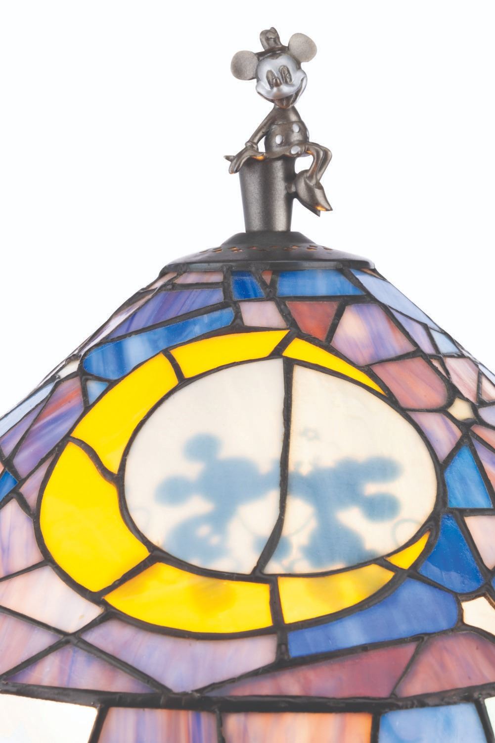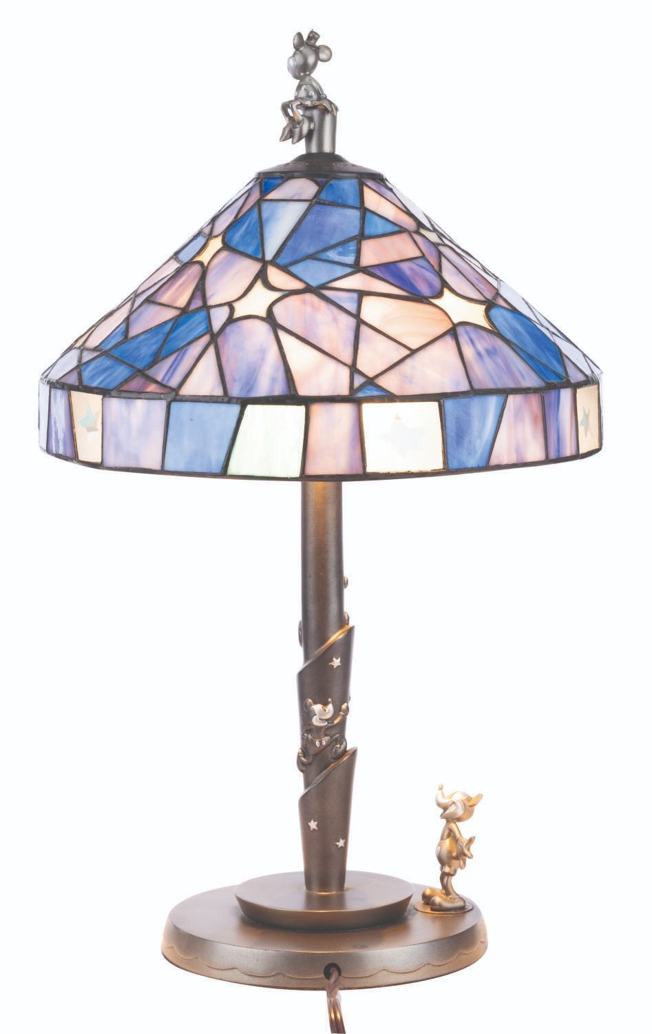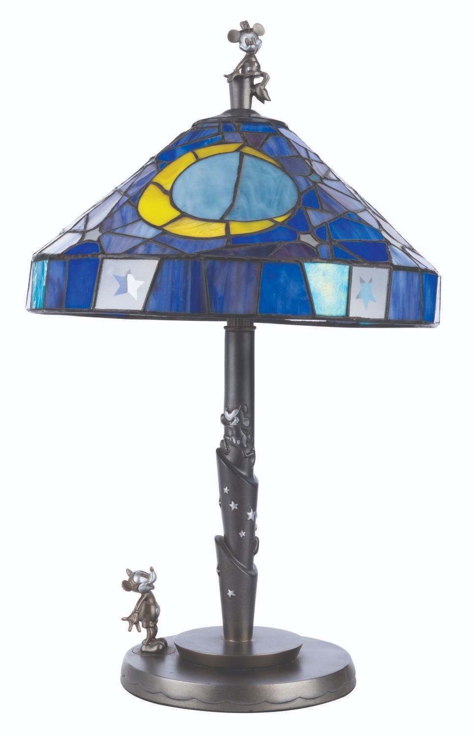 (Disney, 2003) A limited edition stained glass lamp created for the 75th Anniversary of Mickey and Minnie Mouse in 2003. The lamp depicts Mickey on the base and Minnie at the top of the lampshade. When the lamp is turned on, a hidden image is revealed of Mickey and Minnie sharing a kiss within the moon on the lampshade. Created in an edition of only 2500, this lamp measures 21" tall and is in very good condition with (3) small spot marks on the base of the lamp, and a .25" cosmetic crack in the stem of the lamp, just below the shade.