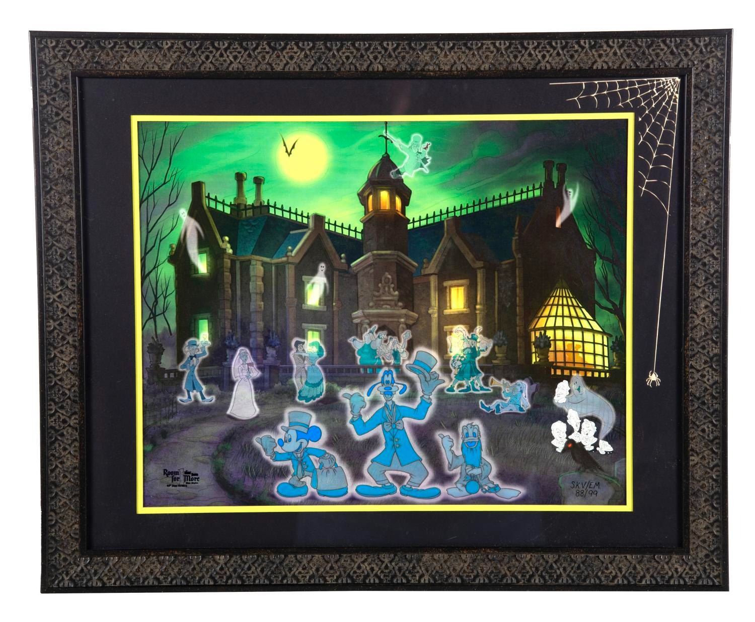 (Walt Disney World, 2011) A "Room for 1 More" 40th Anniversary Magic Kingdom cel featuring Mickey, Goofy, and Donald as the Hitchhiking Ghosts with a Magic Kingdom Haunted Mansion background print. Signed "S.K.V./E.M" and numbered "88/99", the framed piece measures 22.5"x18.25" and is in fine condition.