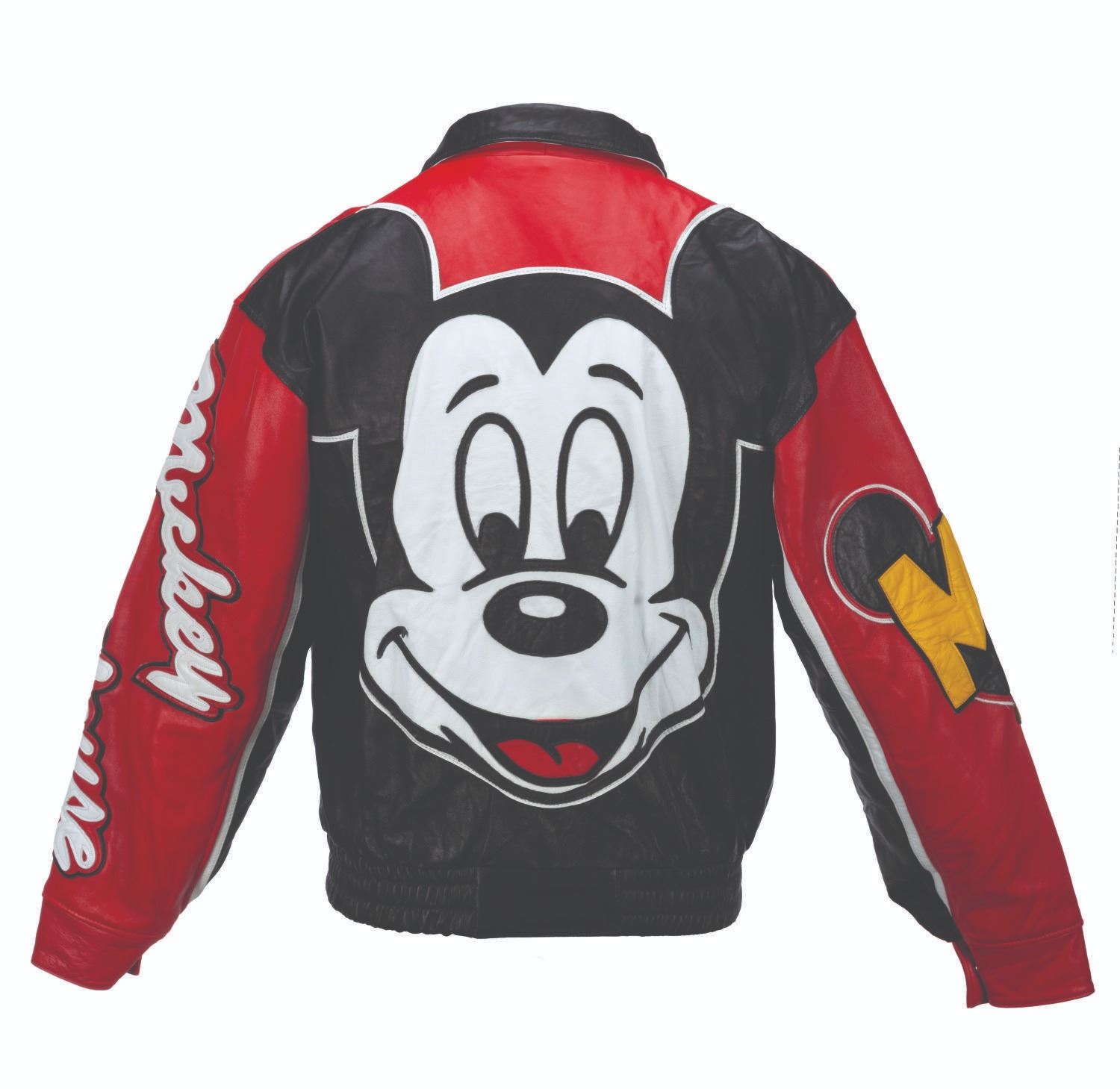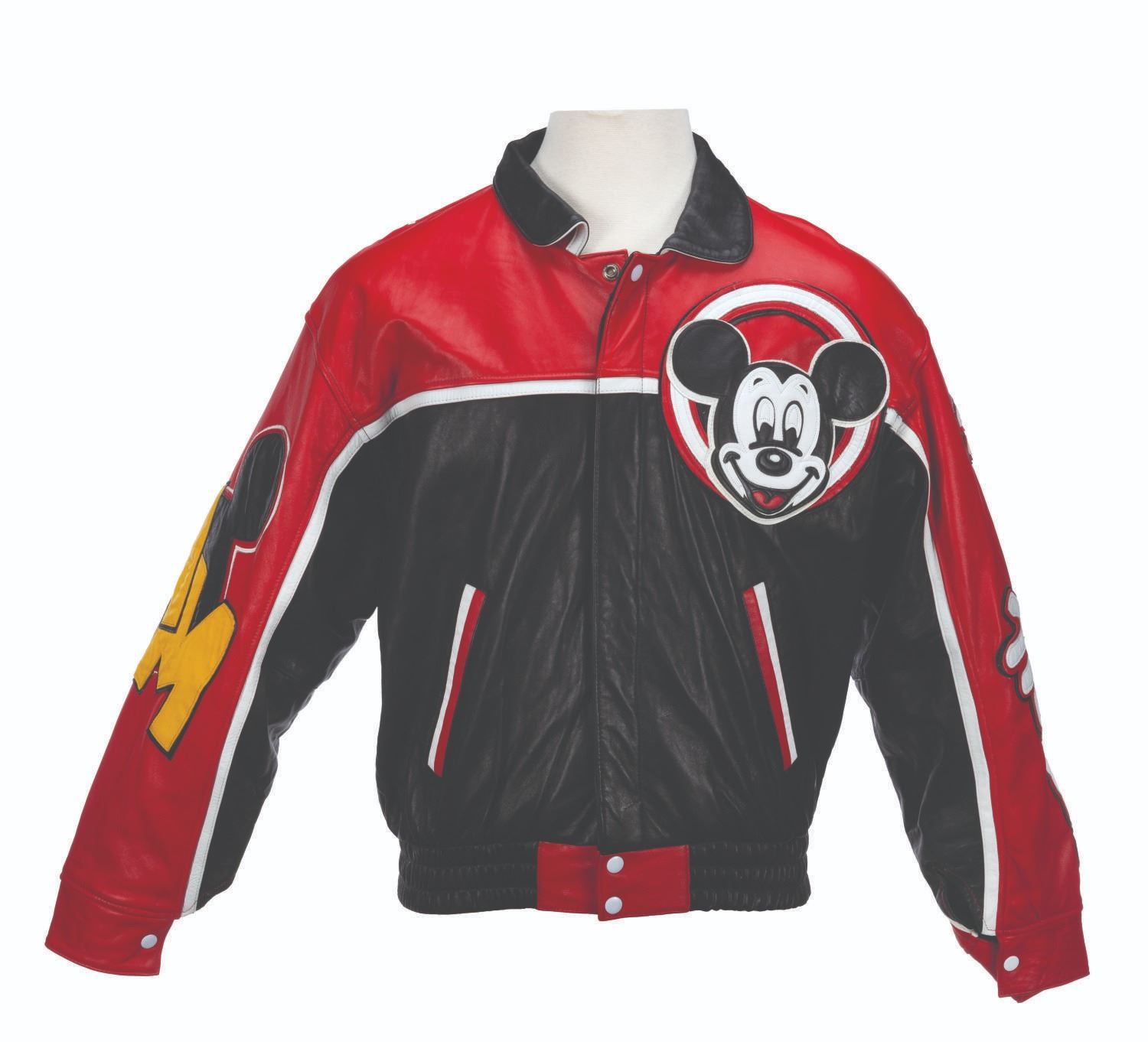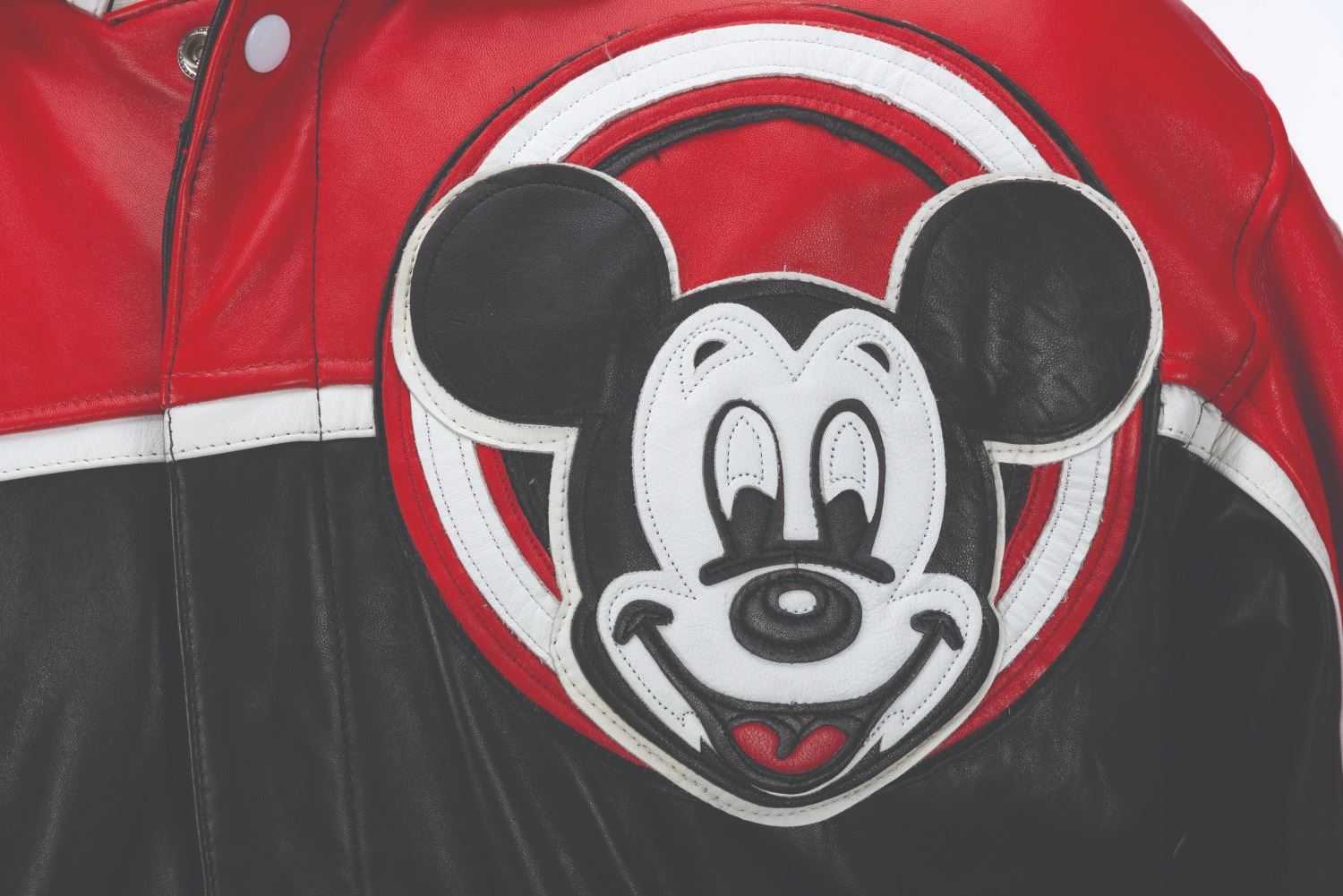 (Disney, 1990s) A Mickey Inc. red, white, and black leather jacket. The embroidered jacket displays Mickey Mouse’s face on the front and back, “Mickey Mouse” text on the left sleeve, and Mickey’s head with a yellow “MM” on the right sleeve. Labeled a size S, the button-up jacket is in very good condition with creases, a minor 0.5” tear, and wear from use.