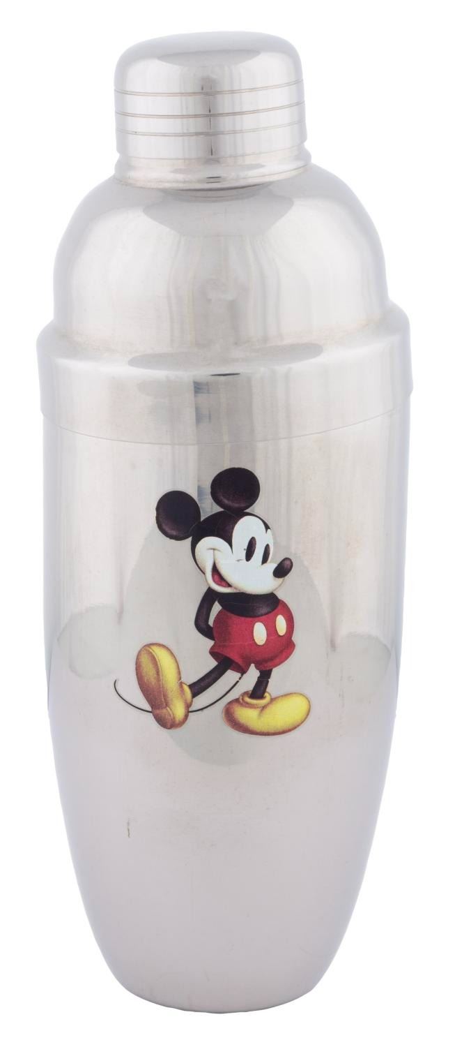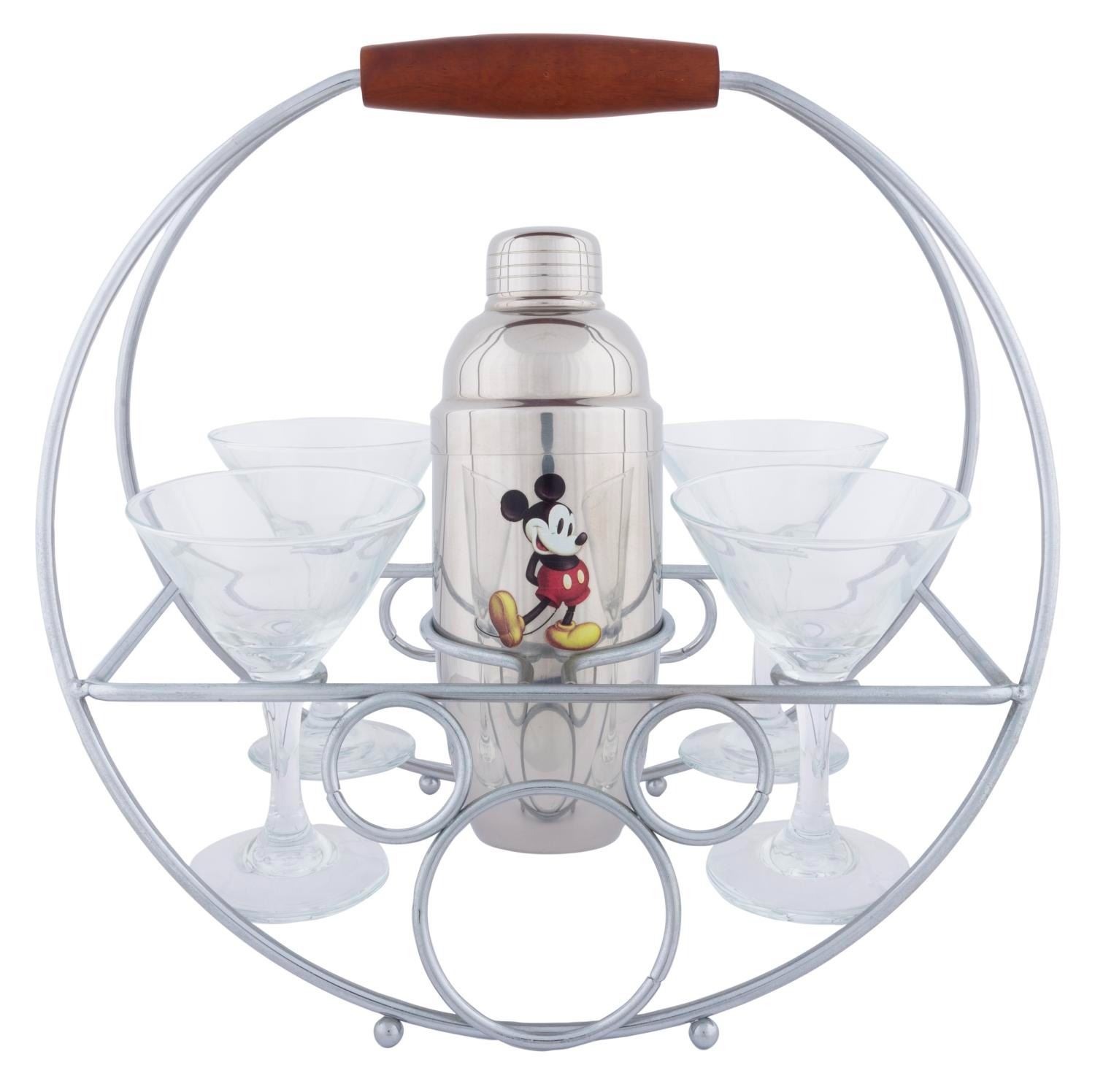 (Disney, 1990s-2000s) A Mickey Mouse martini carrier with four martini glasses and a stainless steel shaker bearing Mickey’s image. The carrier measures 13” x 6” x 13” tall, the shaker 8.5” tall, and the glasses 3.75” in diameter and 5.25” tall. All items are in very good condition with light wear.