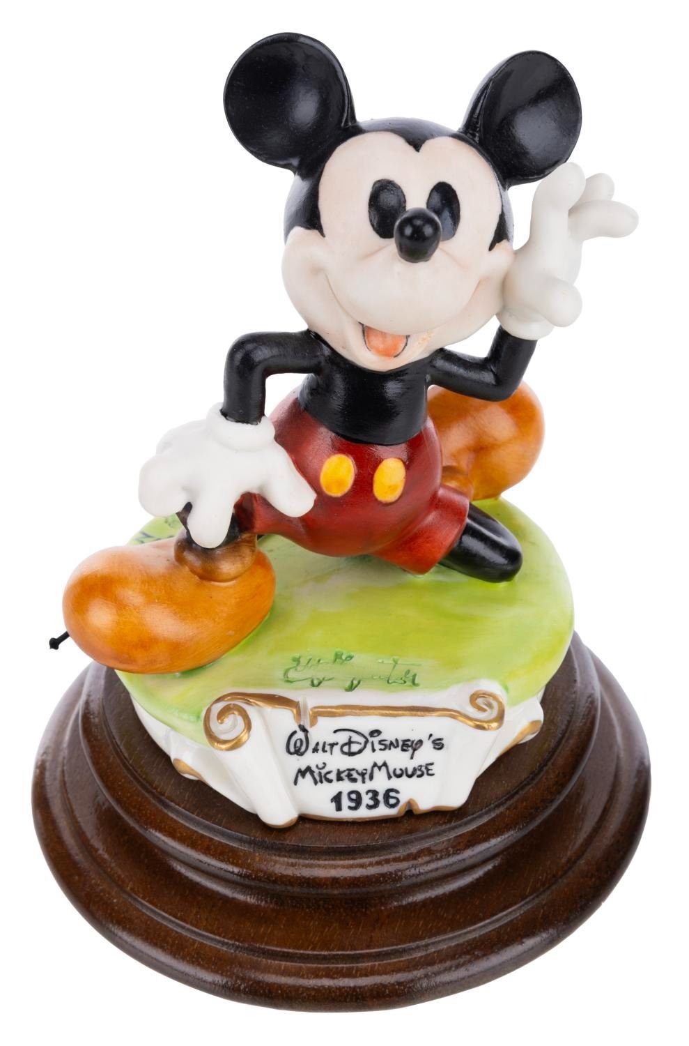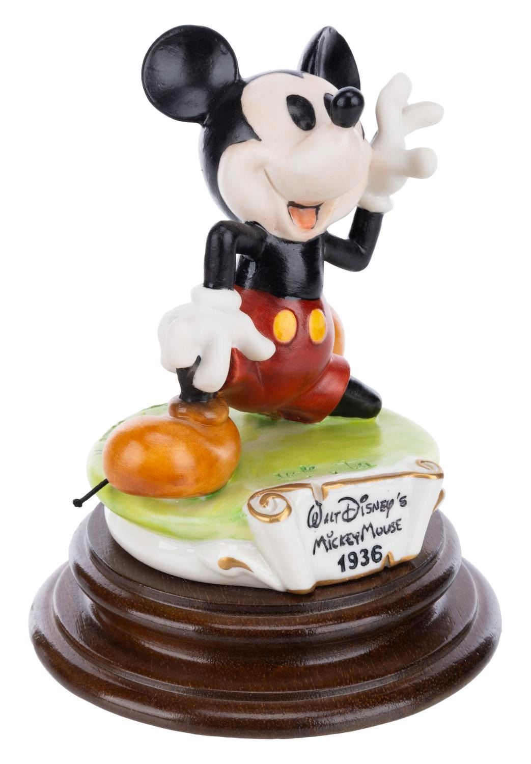 (Capodimonte, 1988) A porcelain figurine of Mickey Mouse as he appeared in 1936, from the "A Walk Through Time with Mickey" series. The piece was sculpted by Enzo Arzenton for the Capodimonte collection and released in a limited edition of 2500 pieces. Measuring 6" x 4.75" x 4.75" tall, the figurine is in fine condition.