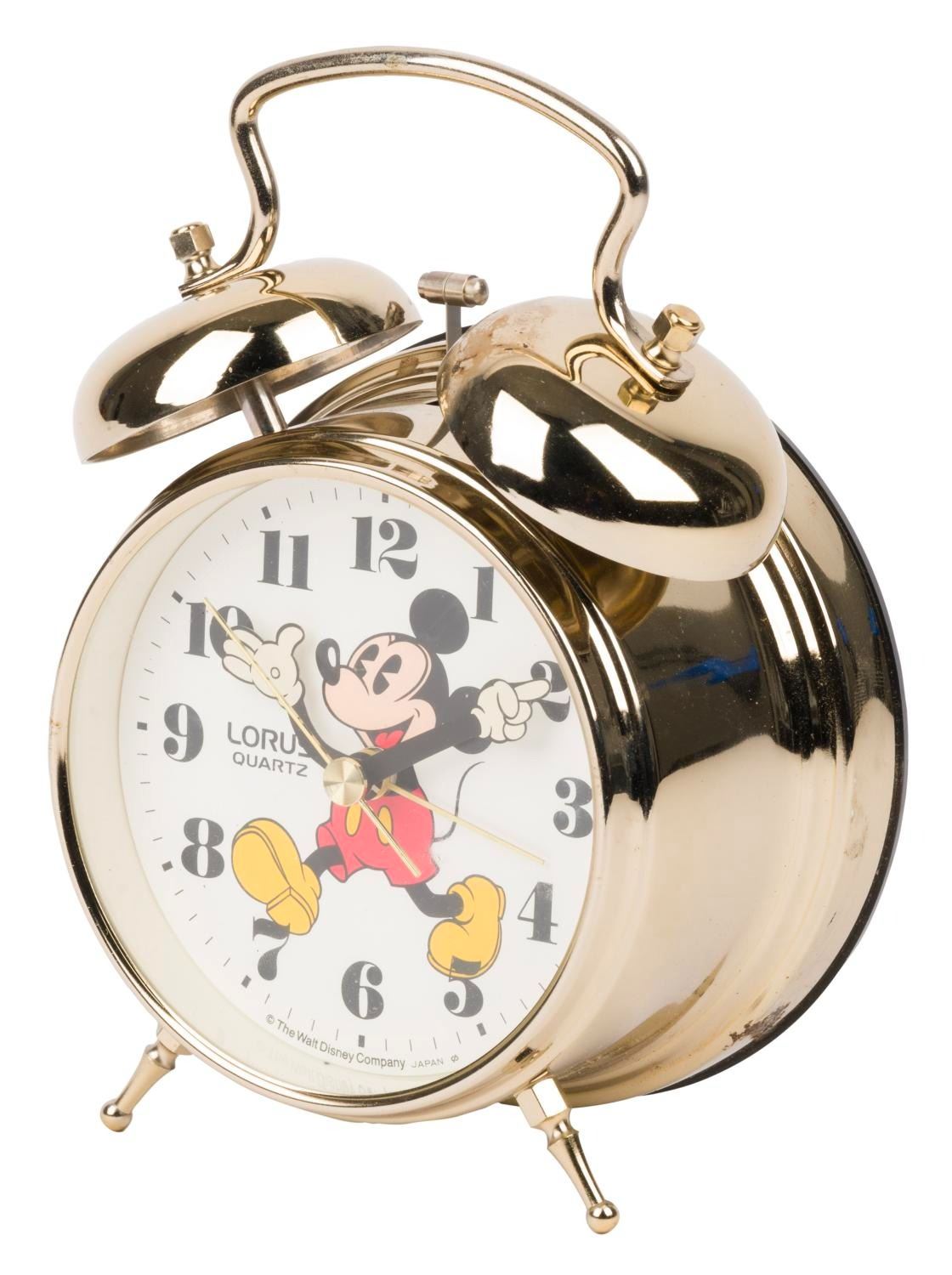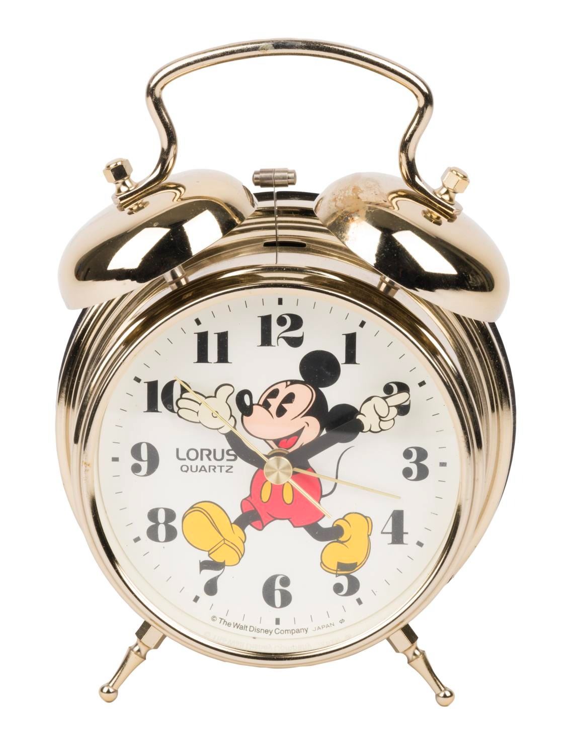 (Lorus, 1984) A Mickey Mouse Quartz alarm clock by Lorus. Measuring 7.5" tall, 5.25" at its widest diameter, and 3" deep, the clock displays in fine as-new condition and comes complete within the original packaging.