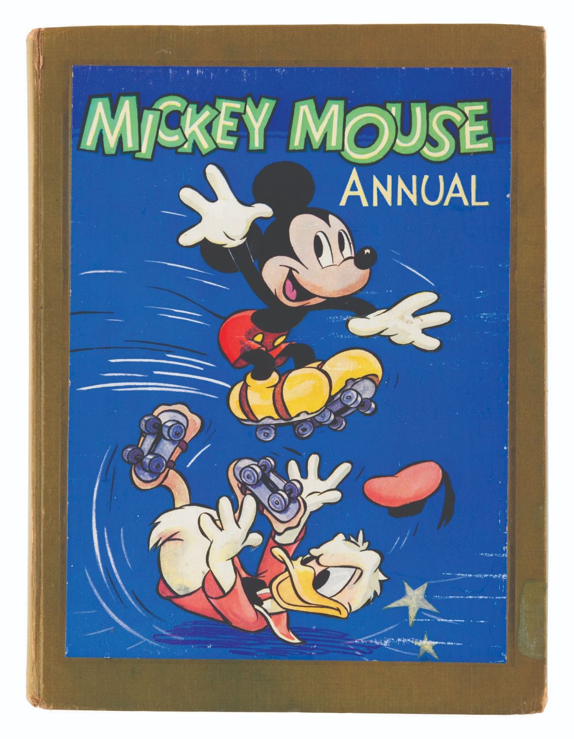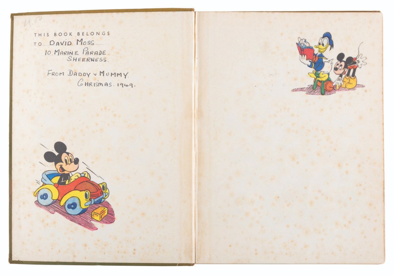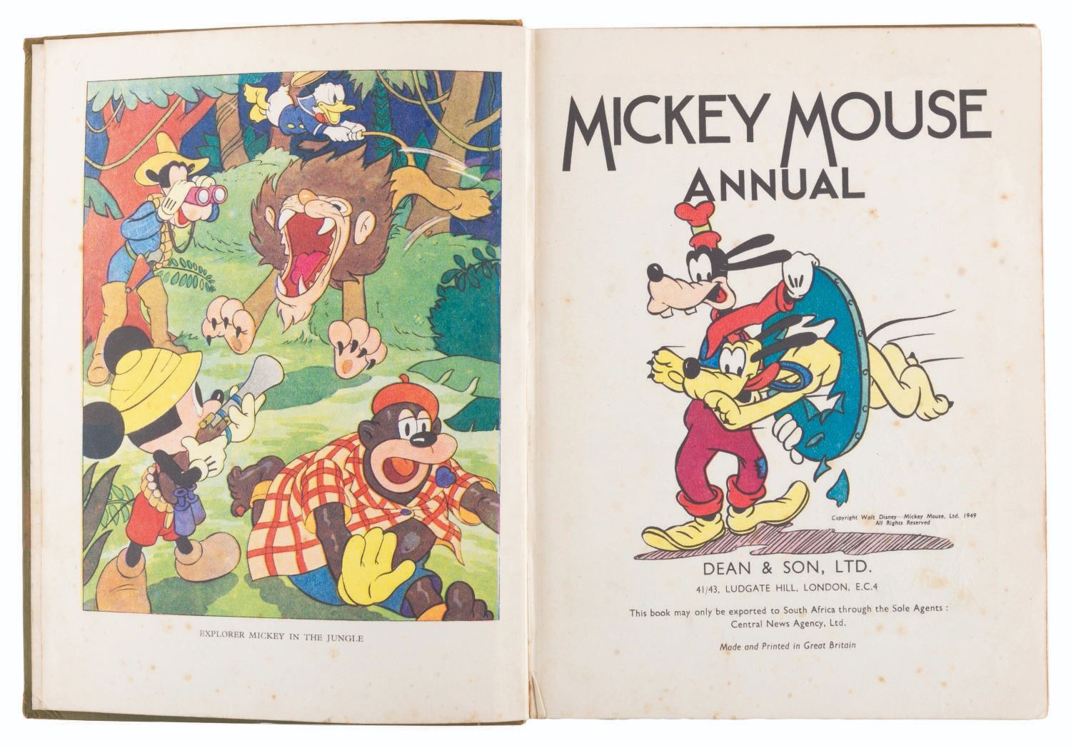 (Dean & Son, Ltd., 1949) A hardcover copy of the 1949 Mickey Mouse Annual. Comprised of comics, stories, and activities featuring Mickey and his friends, the first run of these anthologies were published in England every year from 1931-65. Measuring 7.5" x 9.75", the book is in fair condition with scratches, spotting, an ink inscription on the inside cover, separation at the spine, edge wear, and discoloration from age.