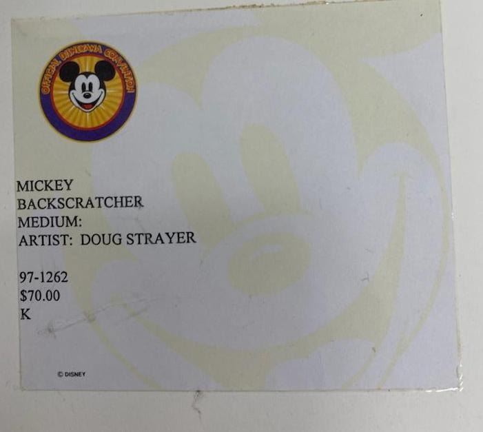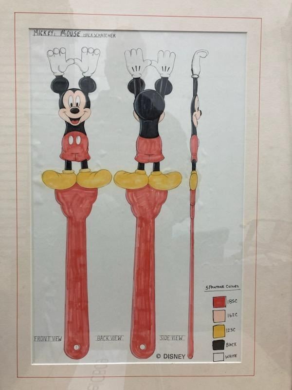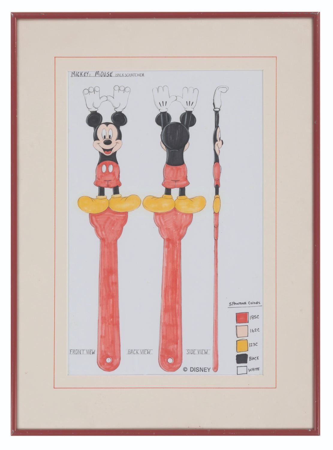 (Disney, 1990s-2000s) A Mickey Mouse back scratcher design by artist Doug Strayer featuring the scratchers front, back, and side views, as well as the five Pantone colors used. Measuring 10.75" x 16.5" in a 16.75" x 23.5" frame, the piece is in good condition with light water damage, while the frame is in good condition with scuffs, chips, and scratches.