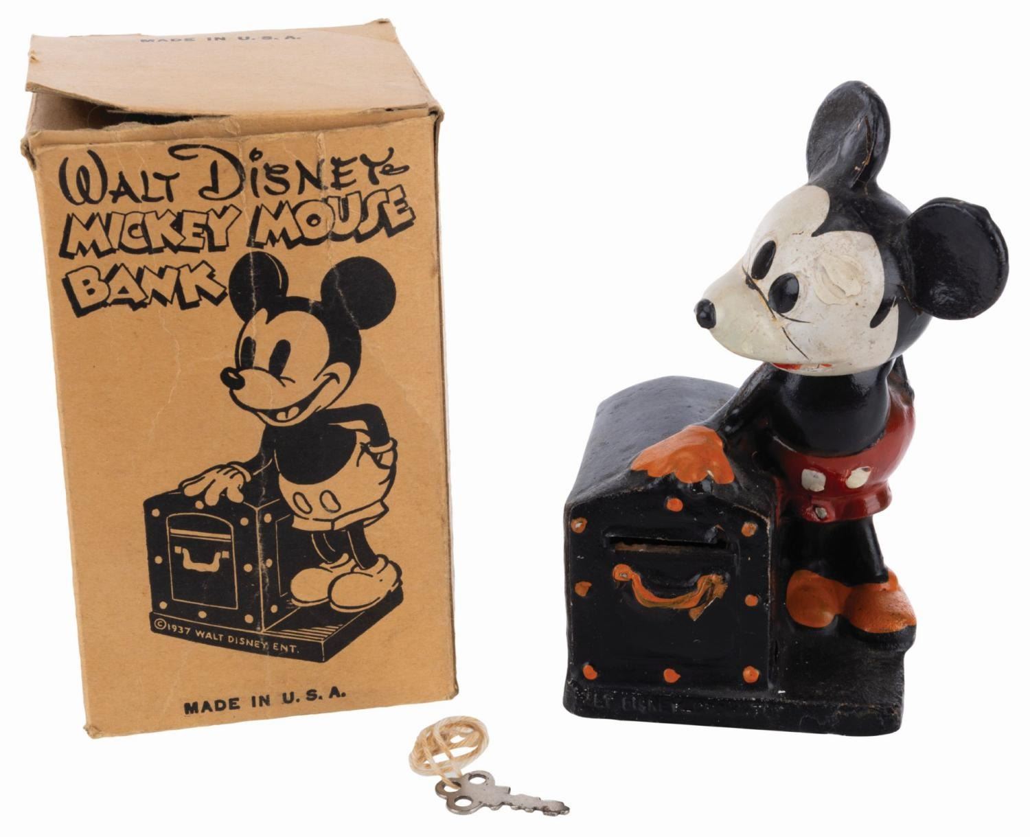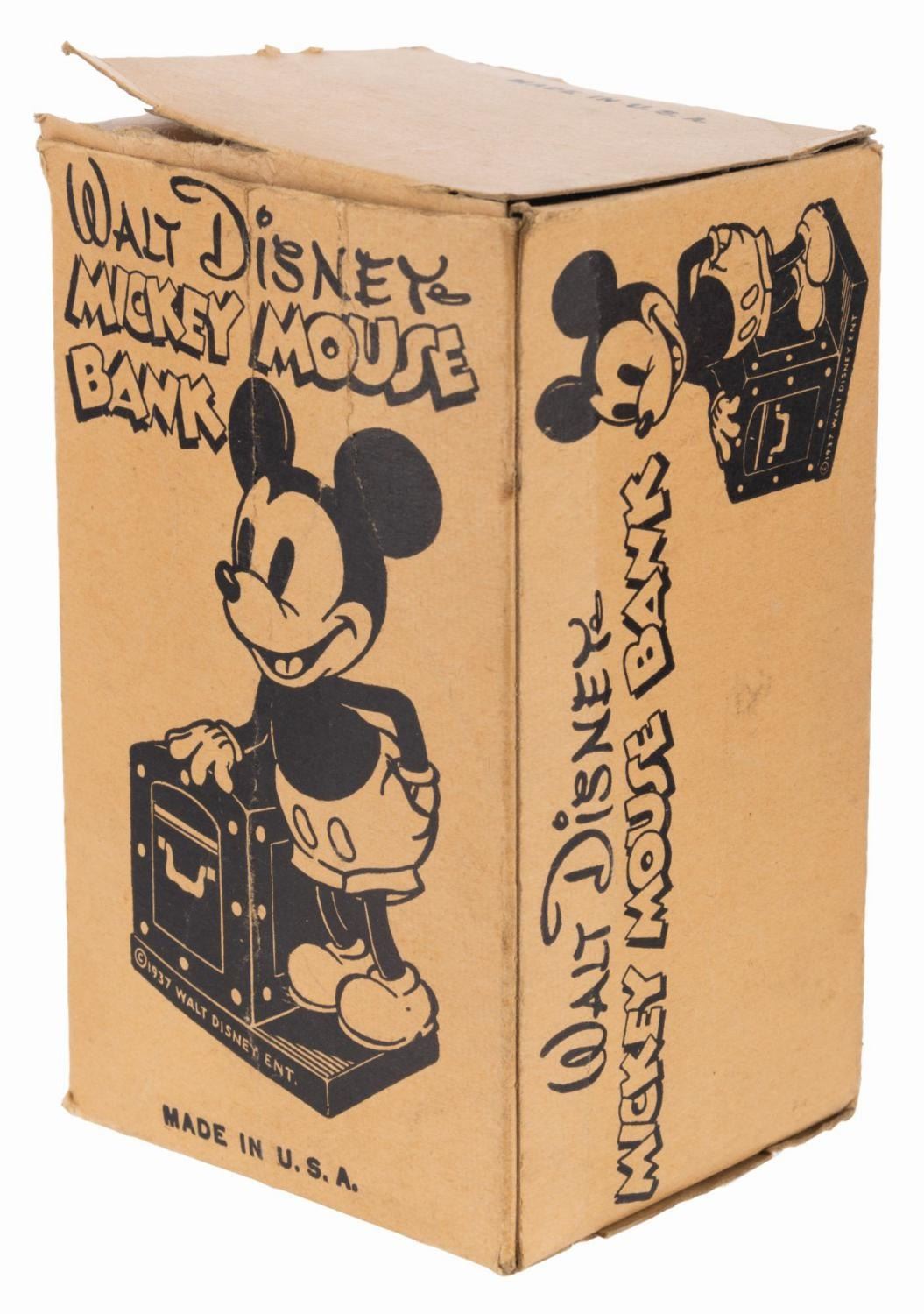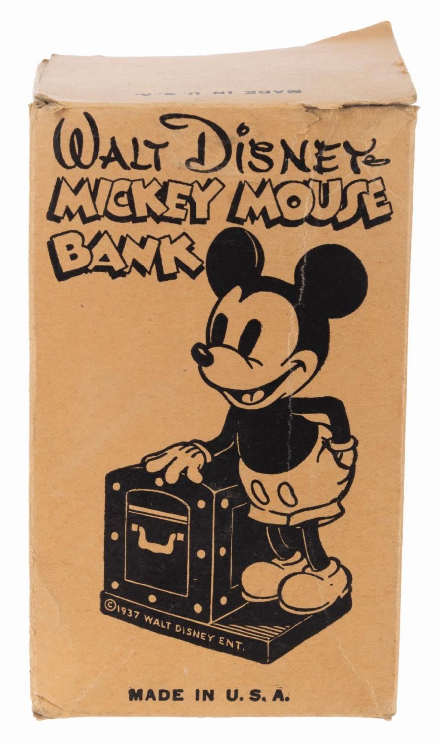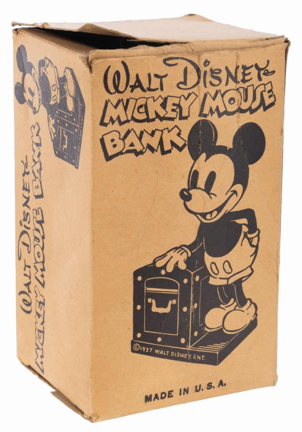 (Crown, 1937) A Walt Disney's Mickey Mouse bank by Crown Toy Manufacturing Company Inc. The composition bank has a movable Mickey head and a metal door with a built-in lock. Measuring 3.25" x 3.25" x 6" tall, the bank displays in good condition with discoloration from age, paint stains, crazing, and cracks, notably on Mickey's face. The bank includes its rarely retained original box, in good condition, with tears and creases.