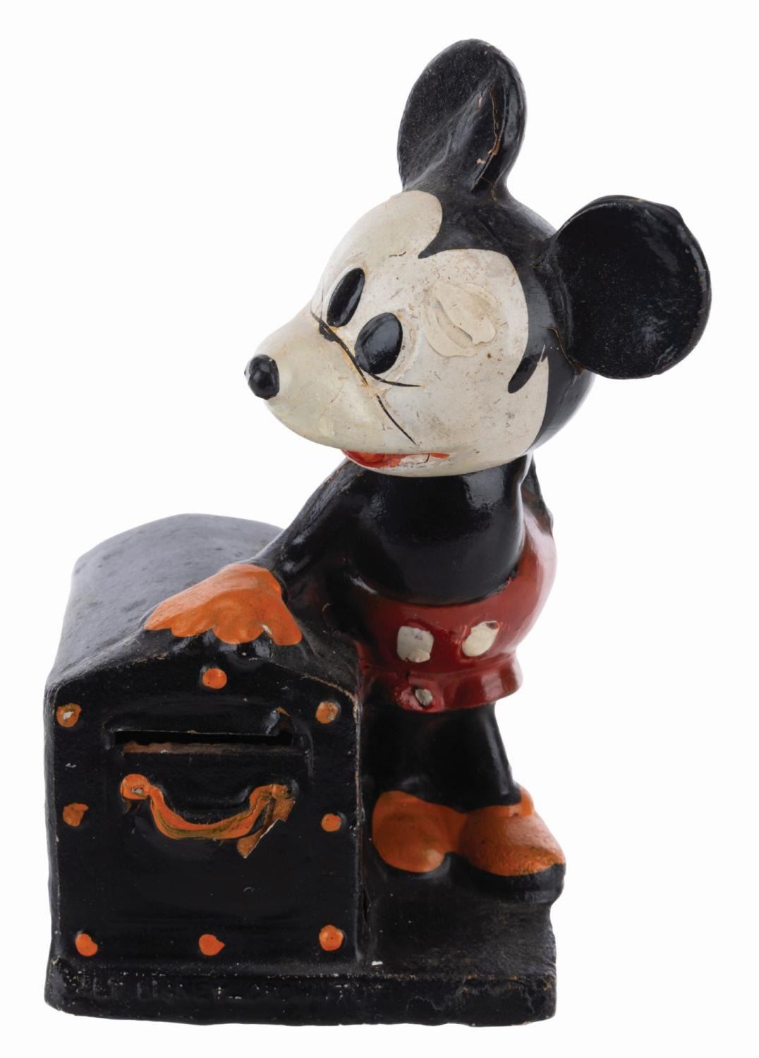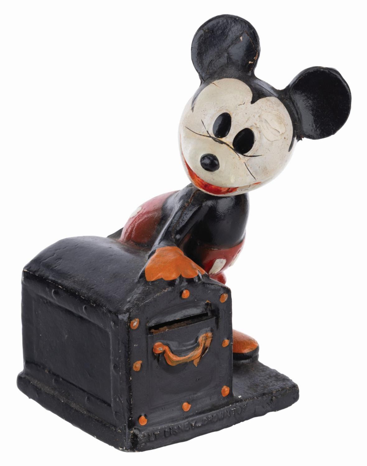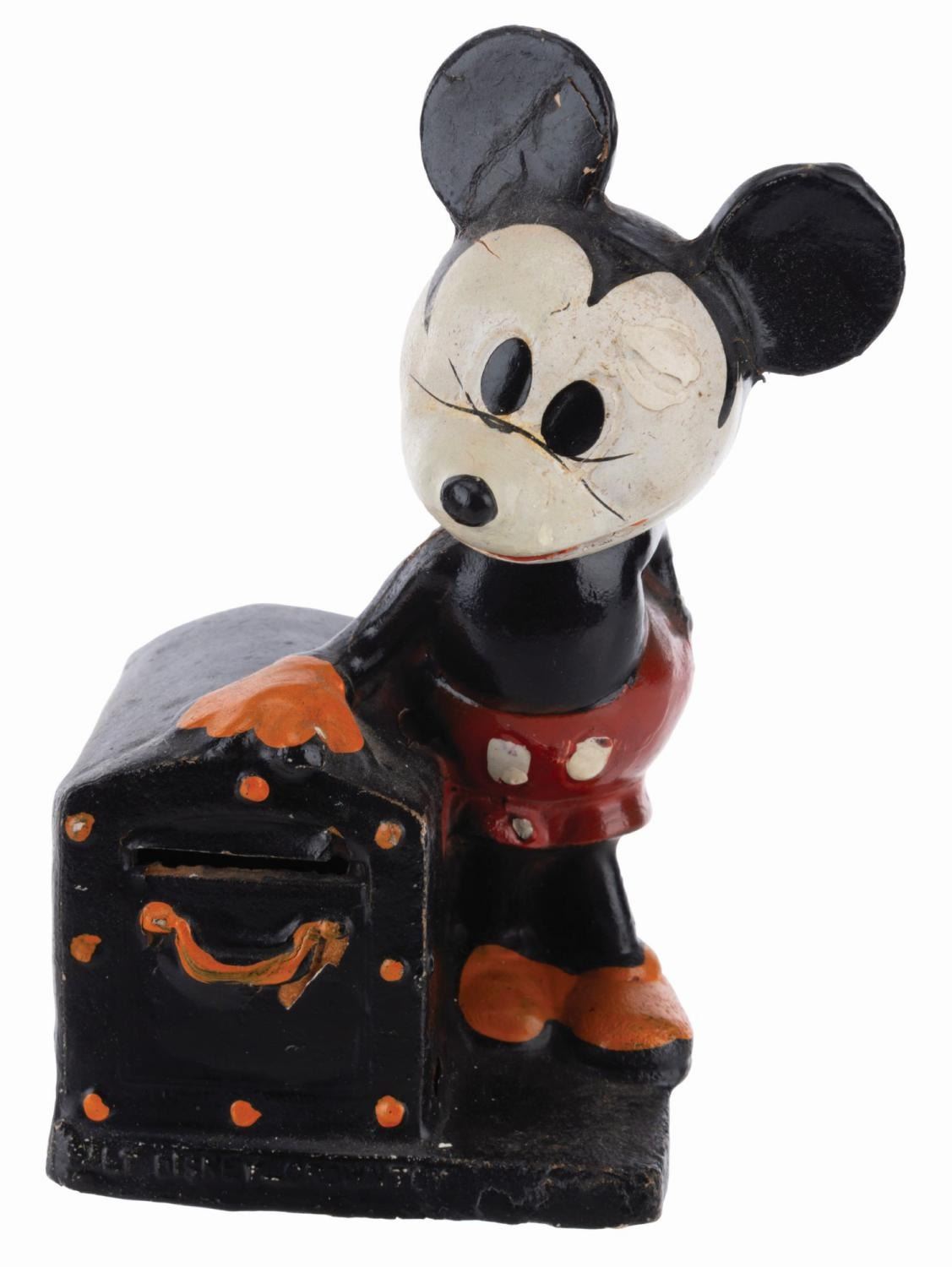 (Crown, 1937) A Walt Disney's Mickey Mouse bank by Crown Toy Manufacturing Company Inc. The composition bank has a movable Mickey head and a metal door with a built-in lock. Measuring 3.25" x 3.25" x 6" tall, the bank displays in good condition with discoloration from age, paint stains, crazing, and cracks, notably on Mickey's face. The bank includes its rarely retained original box, in good condition, with tears and creases.