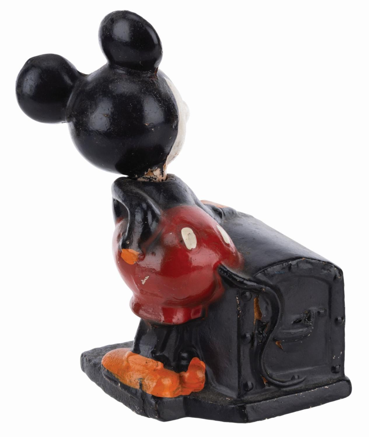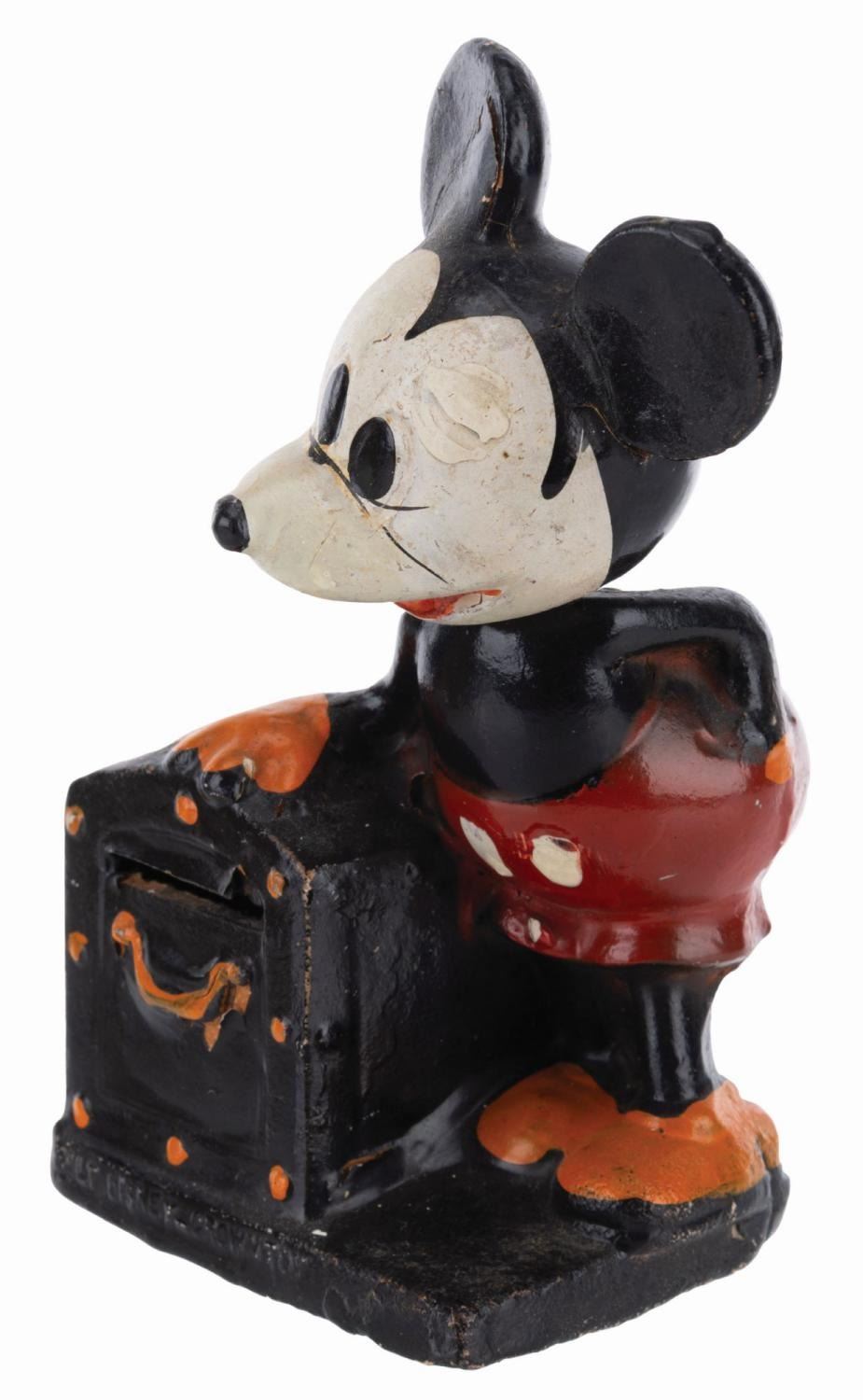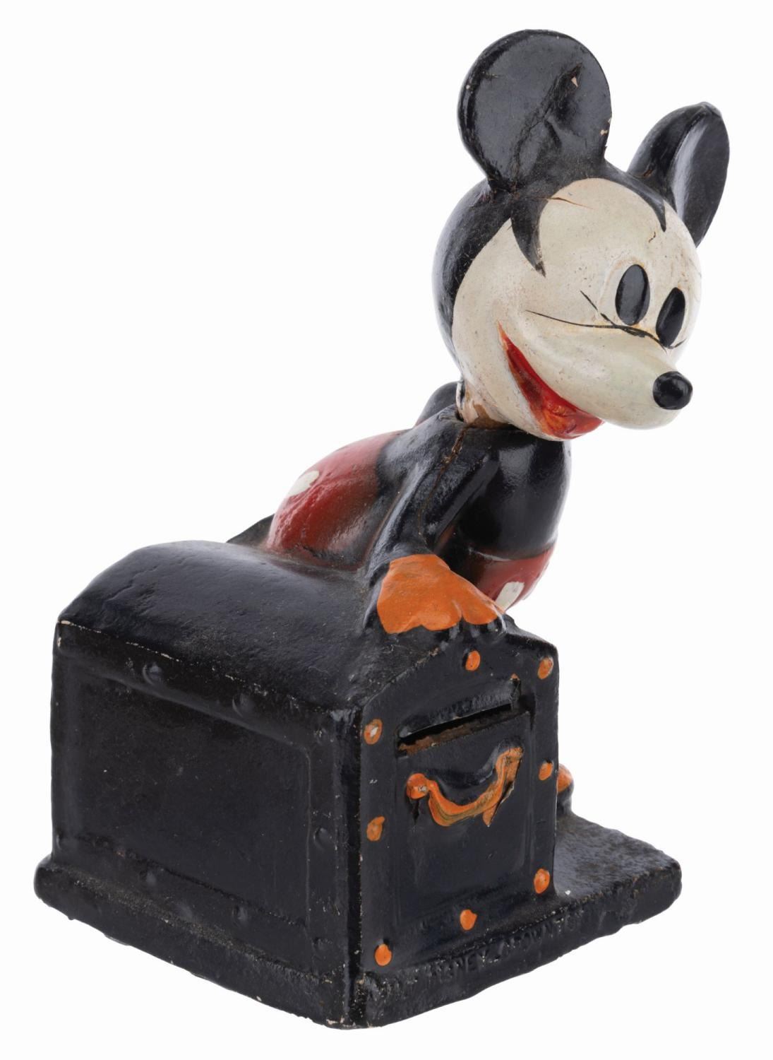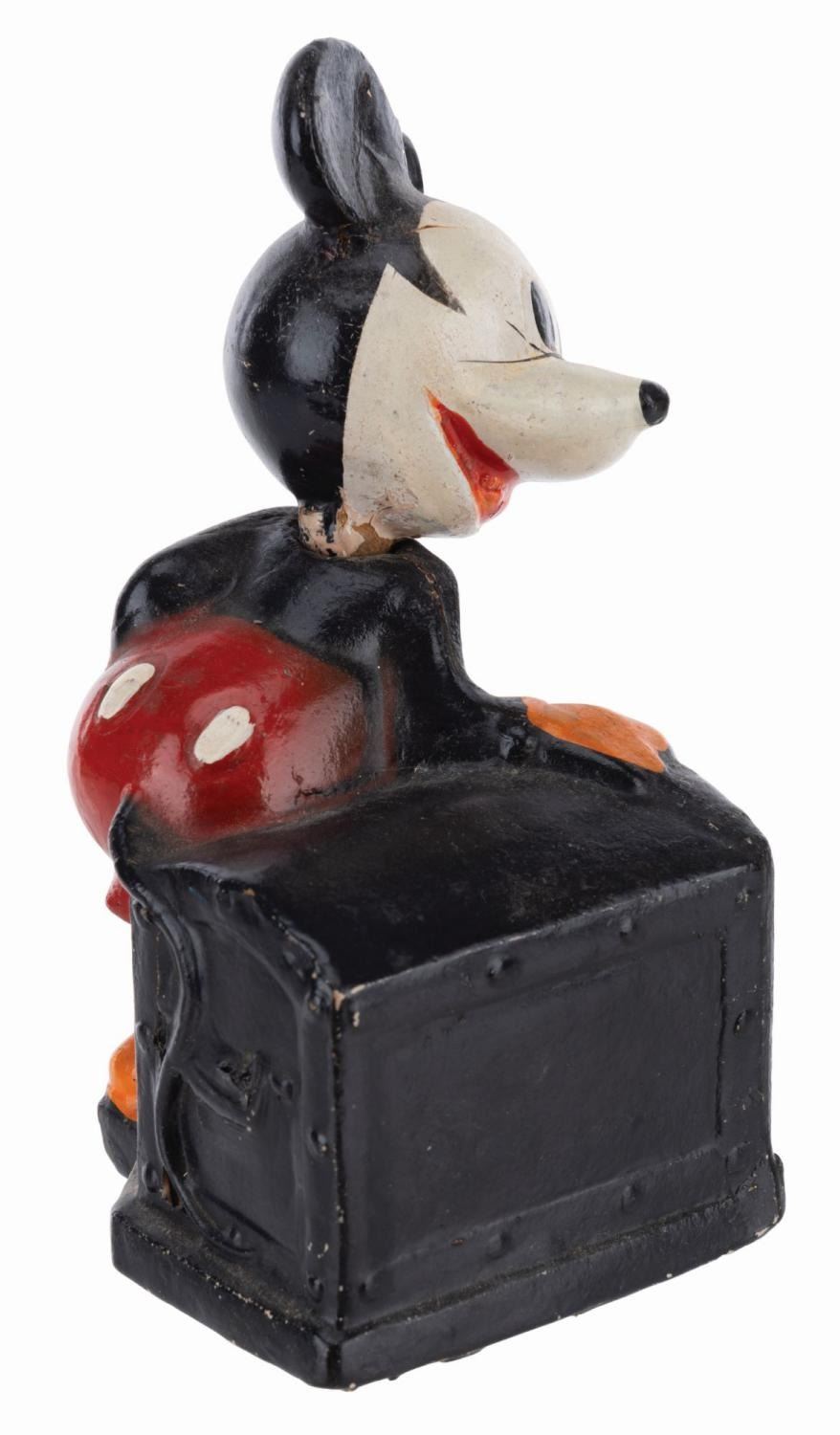 (Crown, 1937) A Walt Disney's Mickey Mouse bank by Crown Toy Manufacturing Company Inc. The composition bank has a movable Mickey head and a metal door with a built-in lock. Measuring 3.25" x 3.25" x 6" tall, the bank displays in good condition with discoloration from age, paint stains, crazing, and cracks, notably on Mickey's face. The bank includes its rarely retained original box, in good condition, with tears and creases.