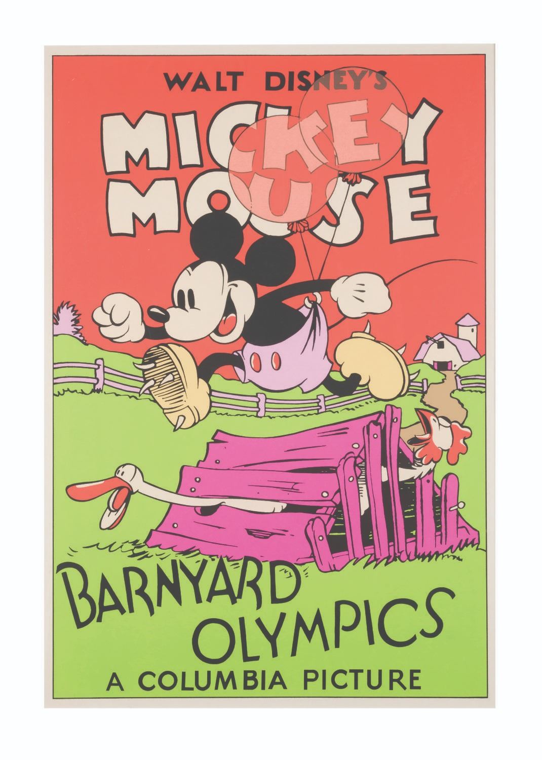 (Circle Fine Art, 1980s) A rare serigraph reproduction of the 1932 poster for the Mickey Mouse cartoon “Barnyard Olympics." The visible image measures 19.25” x 29.5” within an approximately 24” x 33.5” matte. The piece is in fine condition.
