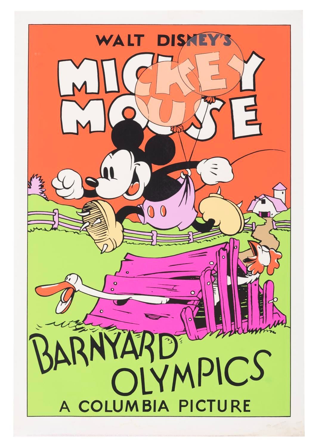 (Circle Fine Art, 1980s) A rare serigraph reproduction of the 1932 poster for the Mickey Mouse cartoon "Barnyard Olympics. The poster measures 22.25" x 31" and displays in very good condition with a small indentation in the upper left quarter, light edge wear including a scratch in the right border, and a faint stain and smudge in the bottom border that do not affect the image.