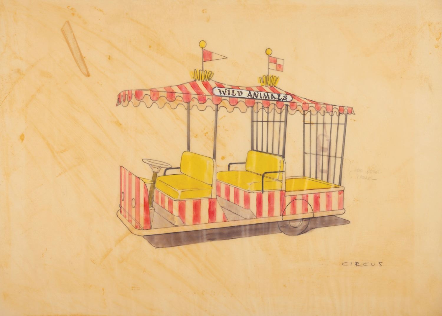 (Disneyland, 1955) An original concept drawing for a Disneyland “Mickey Mouse Club Circus” themed service vehicle by Imagineer Bruce Bushman. Accomplished in ink and watercolor on thin artist’s paper measuring 18.5” x 23.5”, this piece is adhered to a foam core backing. The drawing is in good condition with adhesive discoloration from age throughout, and a 3” tear in the upper left corner that does not affect the image.