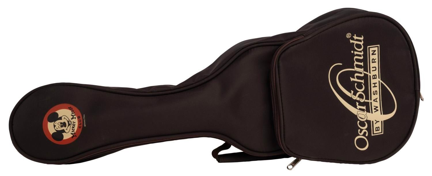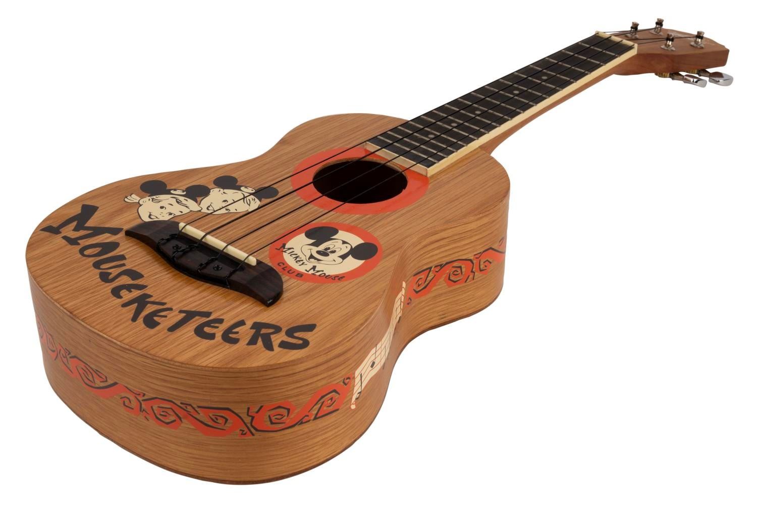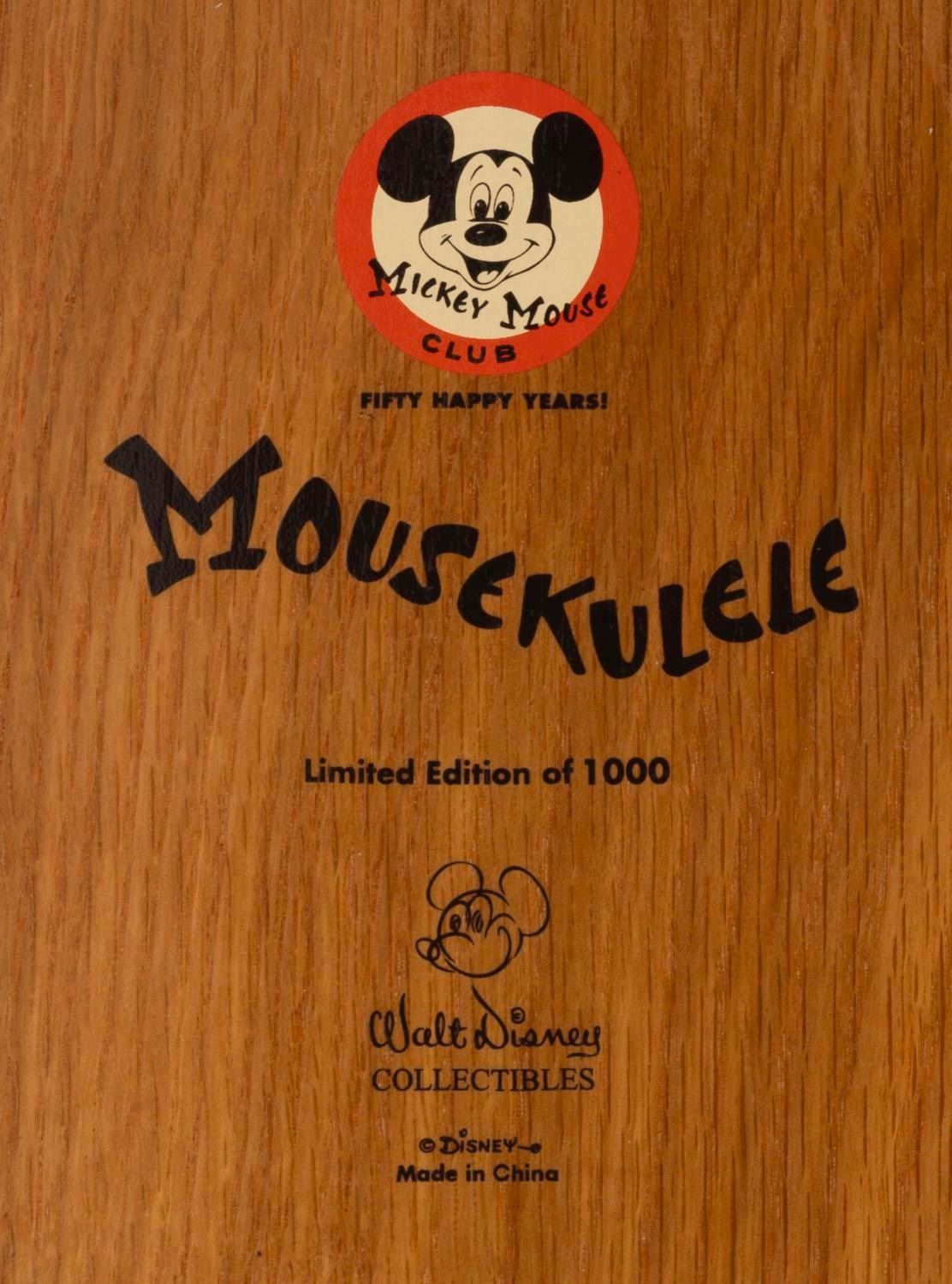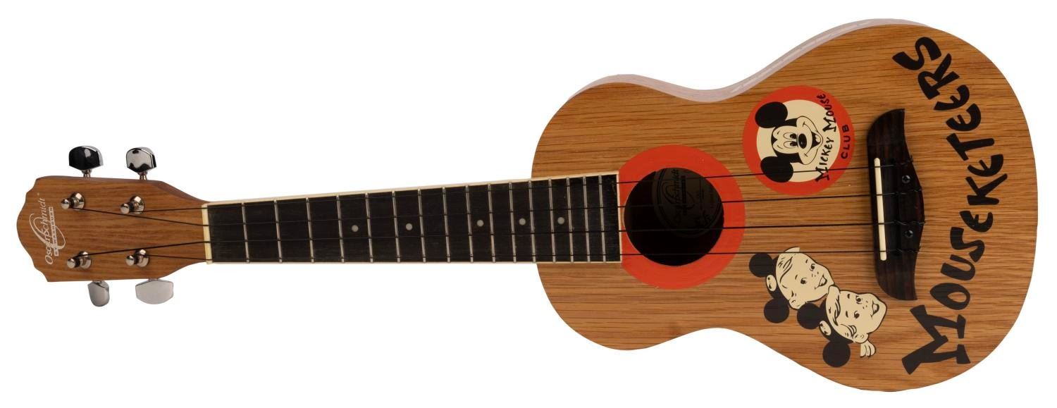 (Washburn, 2005) A limited edition 1000 "Mousekulele" released by Walt Disney Collectibles to celebrate the 50th anniversary of the Mickey Mouse Club. This genuine Oscar Schmidt Ukelele by Washburn features retro designs of the Mickey Mouse club logo and Mouseketeers, and comes with a vinyl case bearing the Mickey Mouse Club logo. Measuring 8" x 24" x 3.75", the ukulele and case are in fine condition.