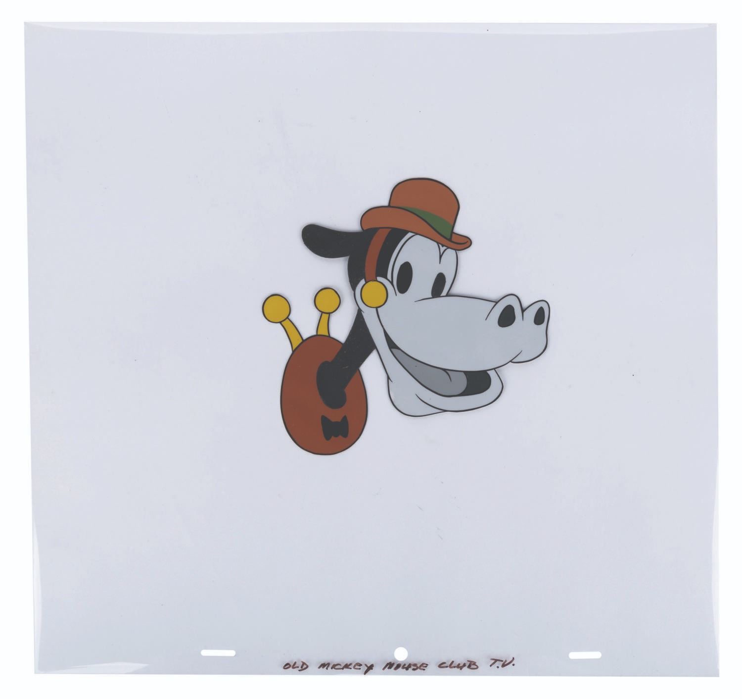 (Disney, 1955) An original production cel of Horace Horsecollar from the title sequence of The Mickey Mouse Club. Horace has an image size of 5.5"x 5.5" on a slightly trimmed 13" x 12.5" animation cel. The artwork is in very good condition with all paint intact.