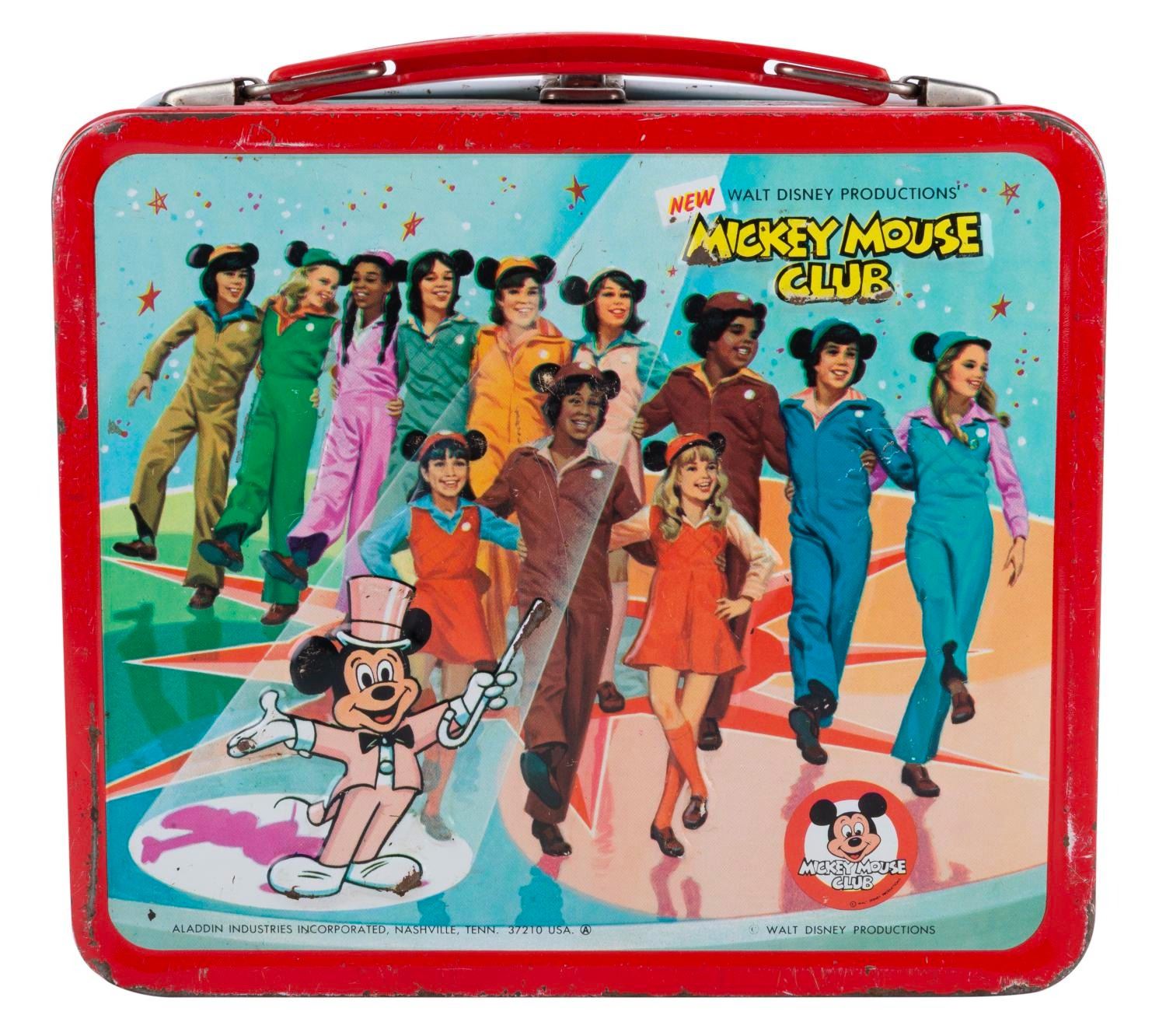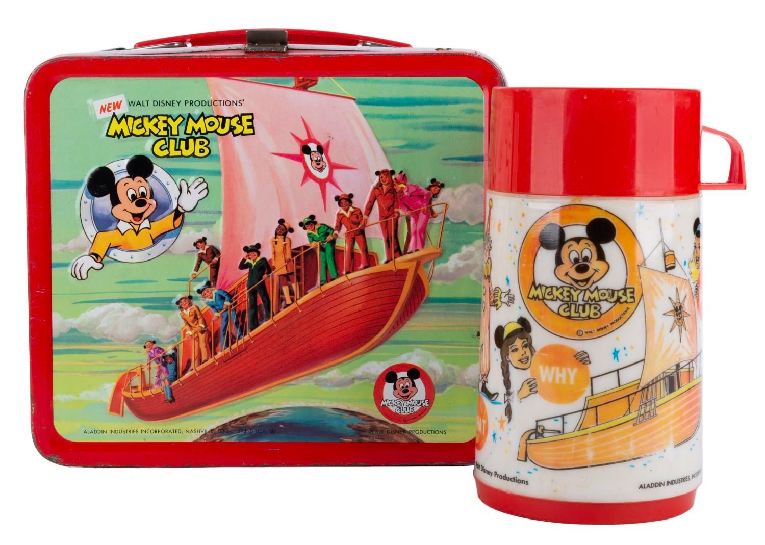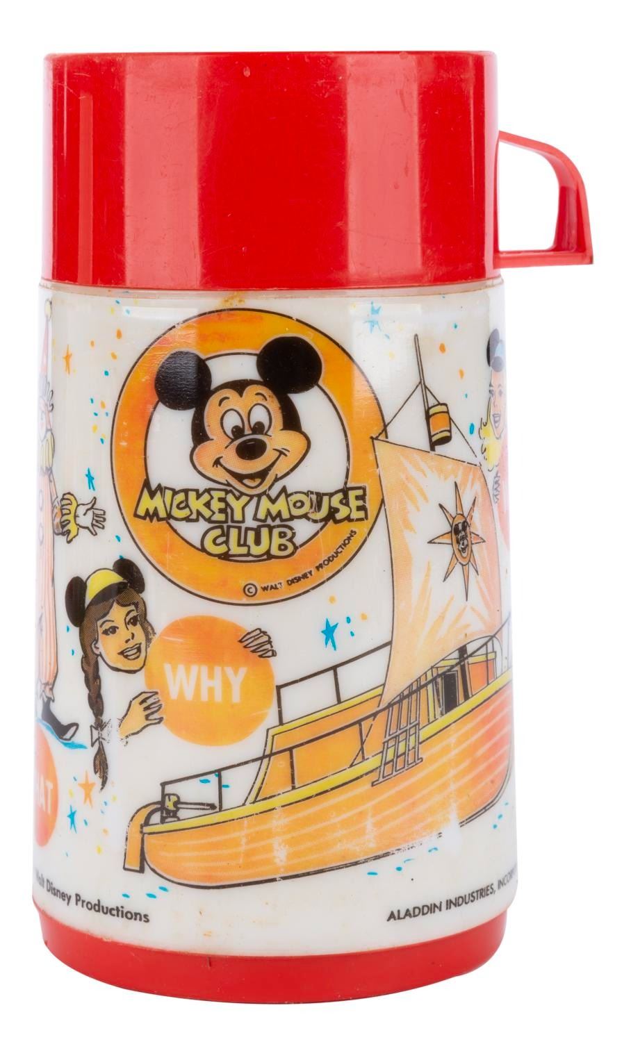 (Aladdin, 1977) A Mickey Mouse Club Lunchbox by Aladdin Industries. Both the lunchbox and Thermos are decorated with imagery of the New Walt Disney Productions Mickey Mouse Club cast from 1977. The lunchbox measures 8.5”x7.5”x4” and the Thermos is 6.5” tall and 3.75” in diameter. The lunch box and Thermos are in good-to-fair condition with much oxidation throughout and wear.