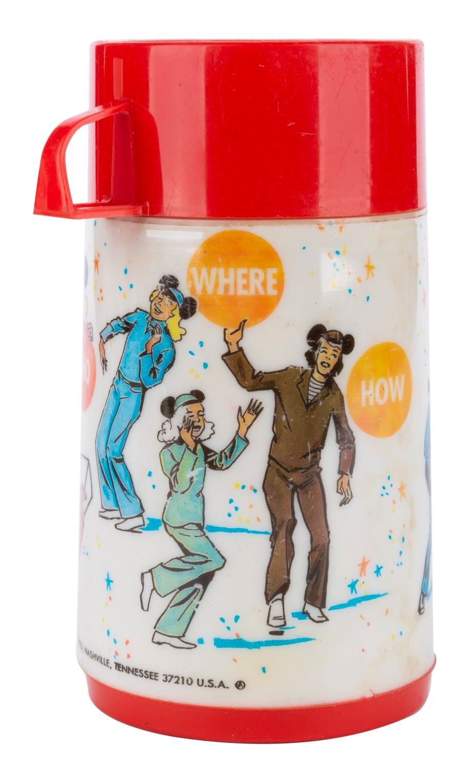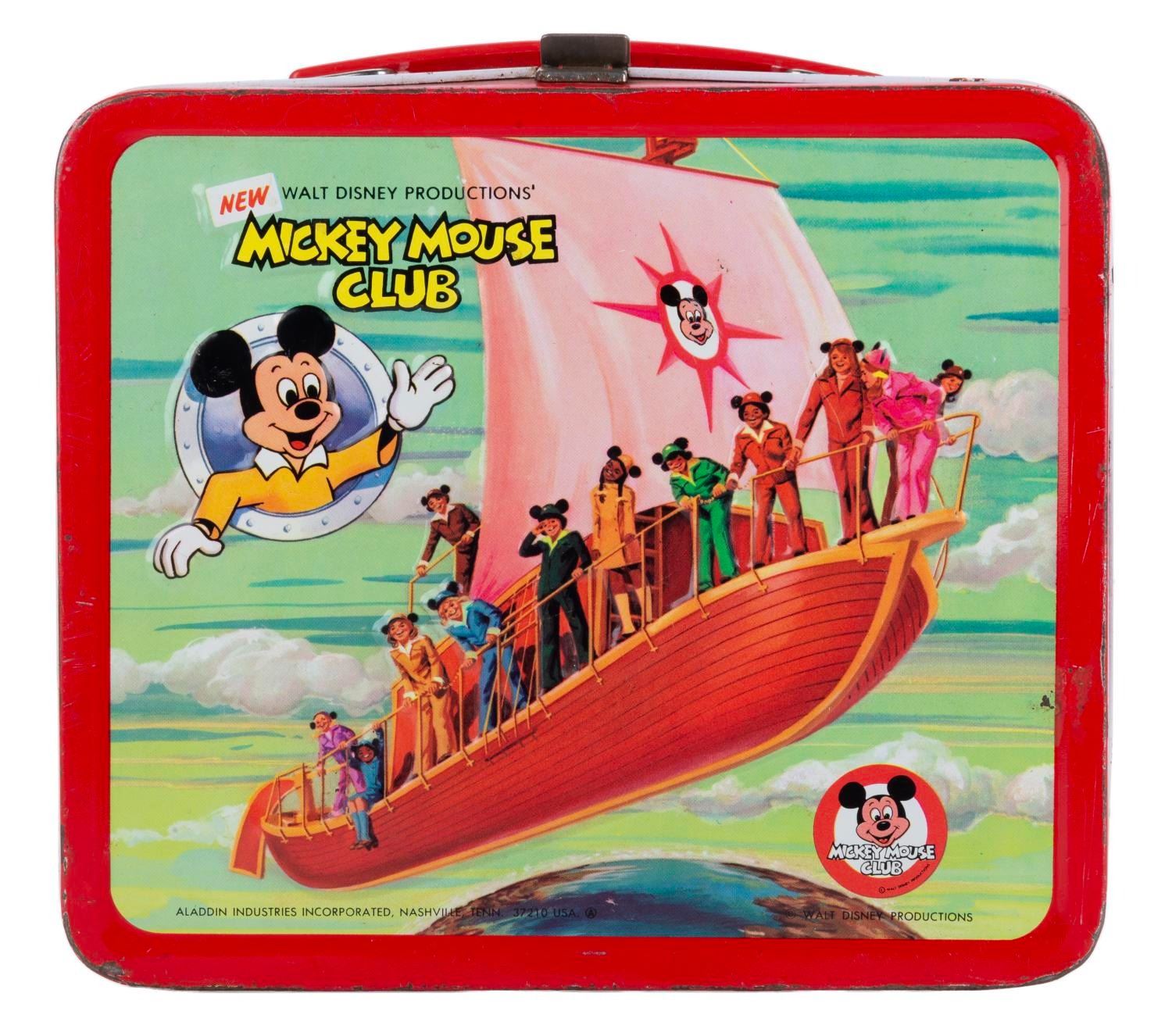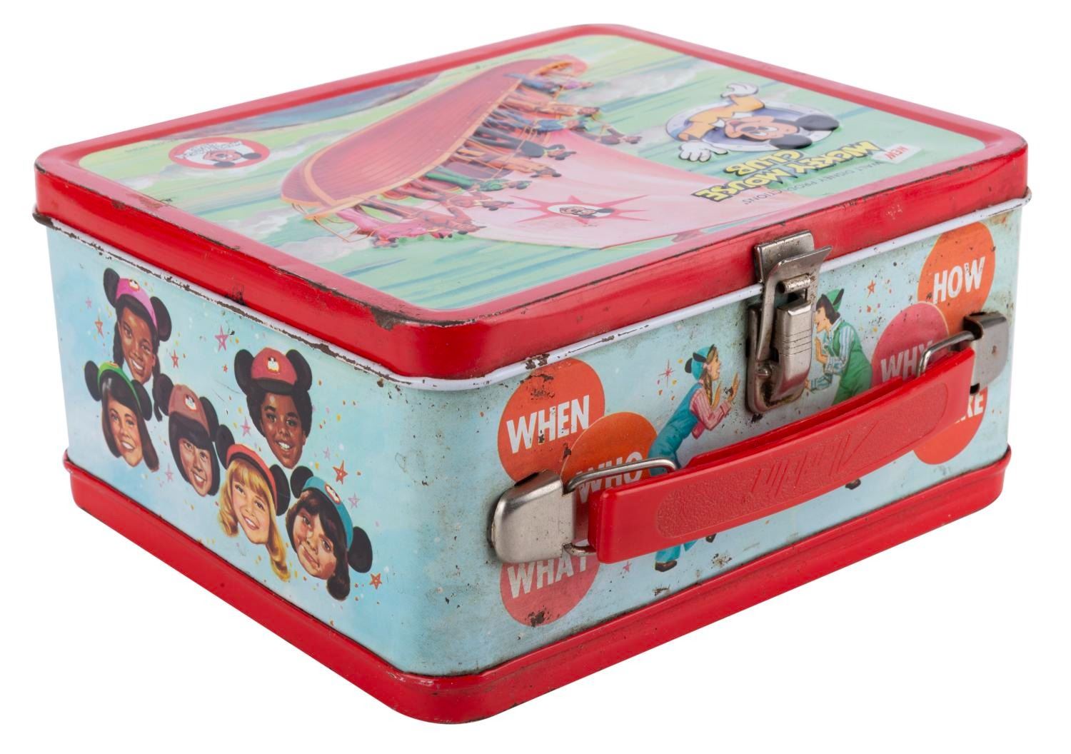 (Aladdin, 1977) A Mickey Mouse Club Lunchbox by Aladdin Industries. Both the lunchbox and Thermos are decorated with imagery of the New Walt Disney Productions Mickey Mouse Club cast from 1977. The lunchbox measures 8.5”x7.5”x4” and the Thermos is 6.5” tall and 3.75” in diameter. The lunch box and Thermos are in good-to-fair condition with much oxidation throughout and wear.