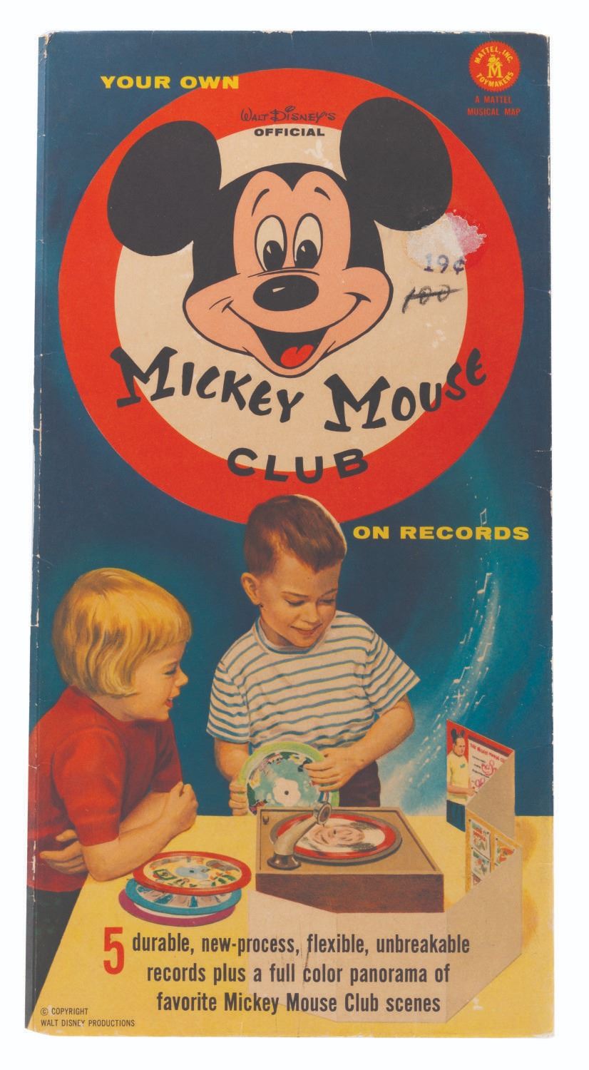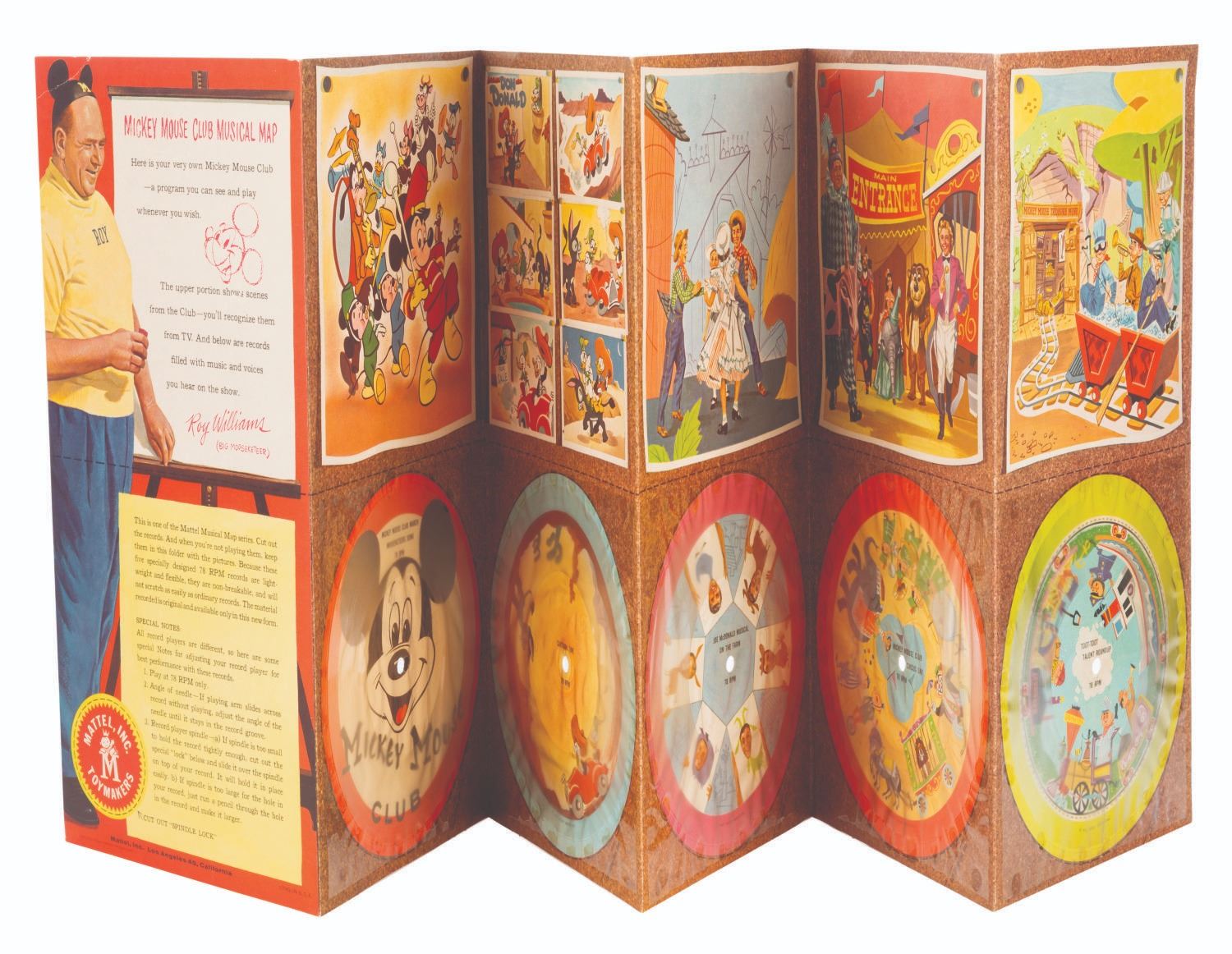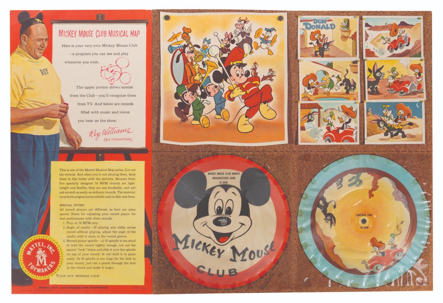 (Mattel, 1955) A Mattel Mickey Mouse Club Musical Map record set featuring music and voices from the Mickey Mouse Club television series in a fun collection of fine cut-out lightweight and flexible 78 rpm records. Measuring 14.5”x7.5” the record sleeve containing the unpunched records and record lock is in good condition exhibiting tape repairs, color fading, creases, and wear.