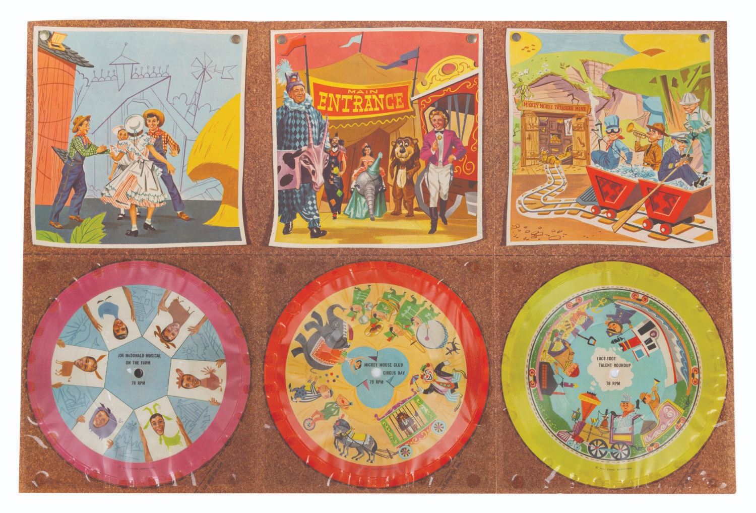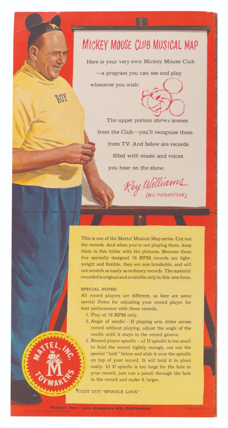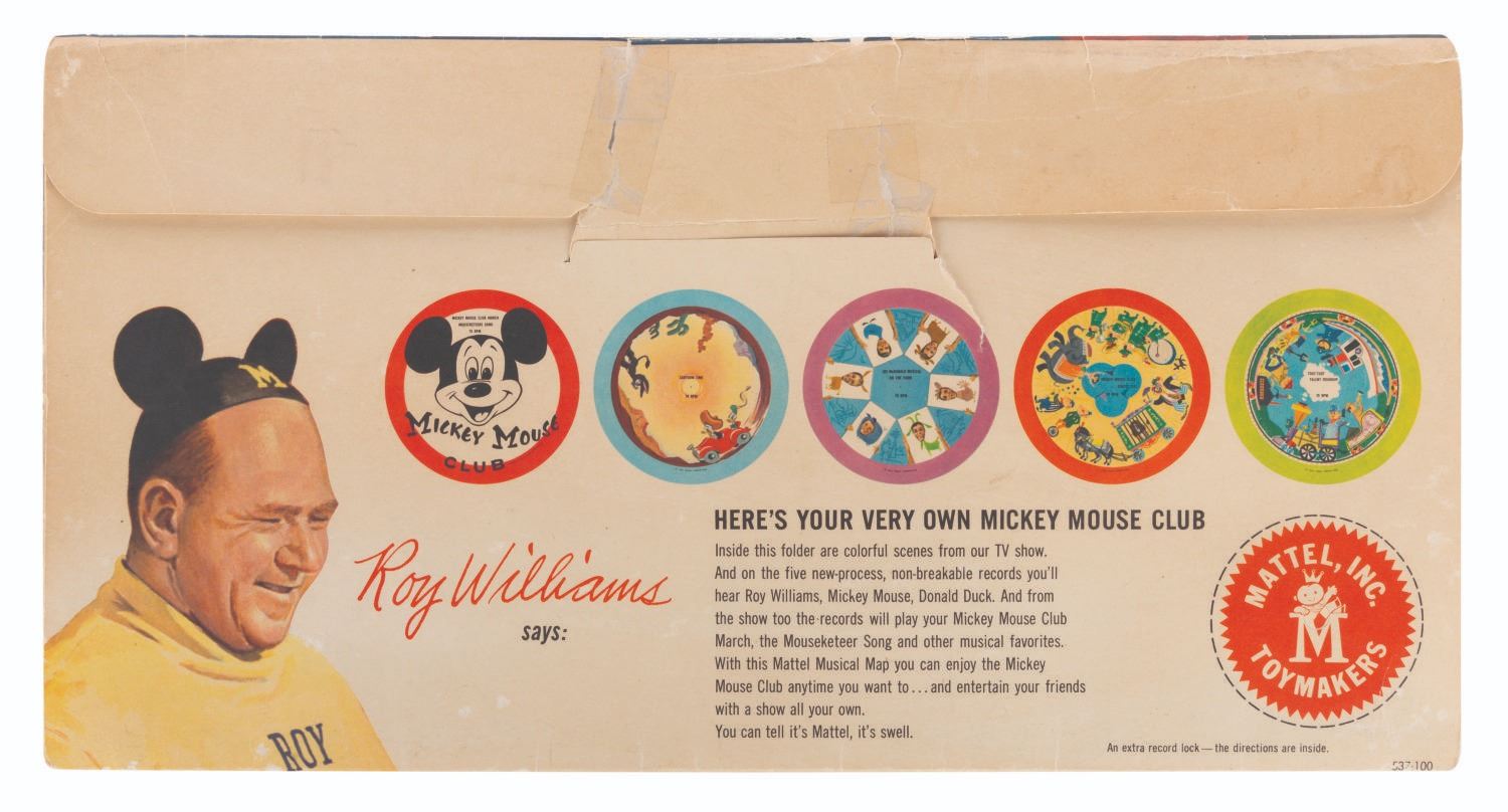 (Mattel, 1955) A Mattel Mickey Mouse Club Musical Map record set featuring music and voices from the Mickey Mouse Club television series in a fun collection of fine cut-out lightweight and flexible 78 rpm records. Measuring 14.5”x7.5” the record sleeve containing the unpunched records and record lock is in good condition exhibiting tape repairs, color fading, creases, and wear.