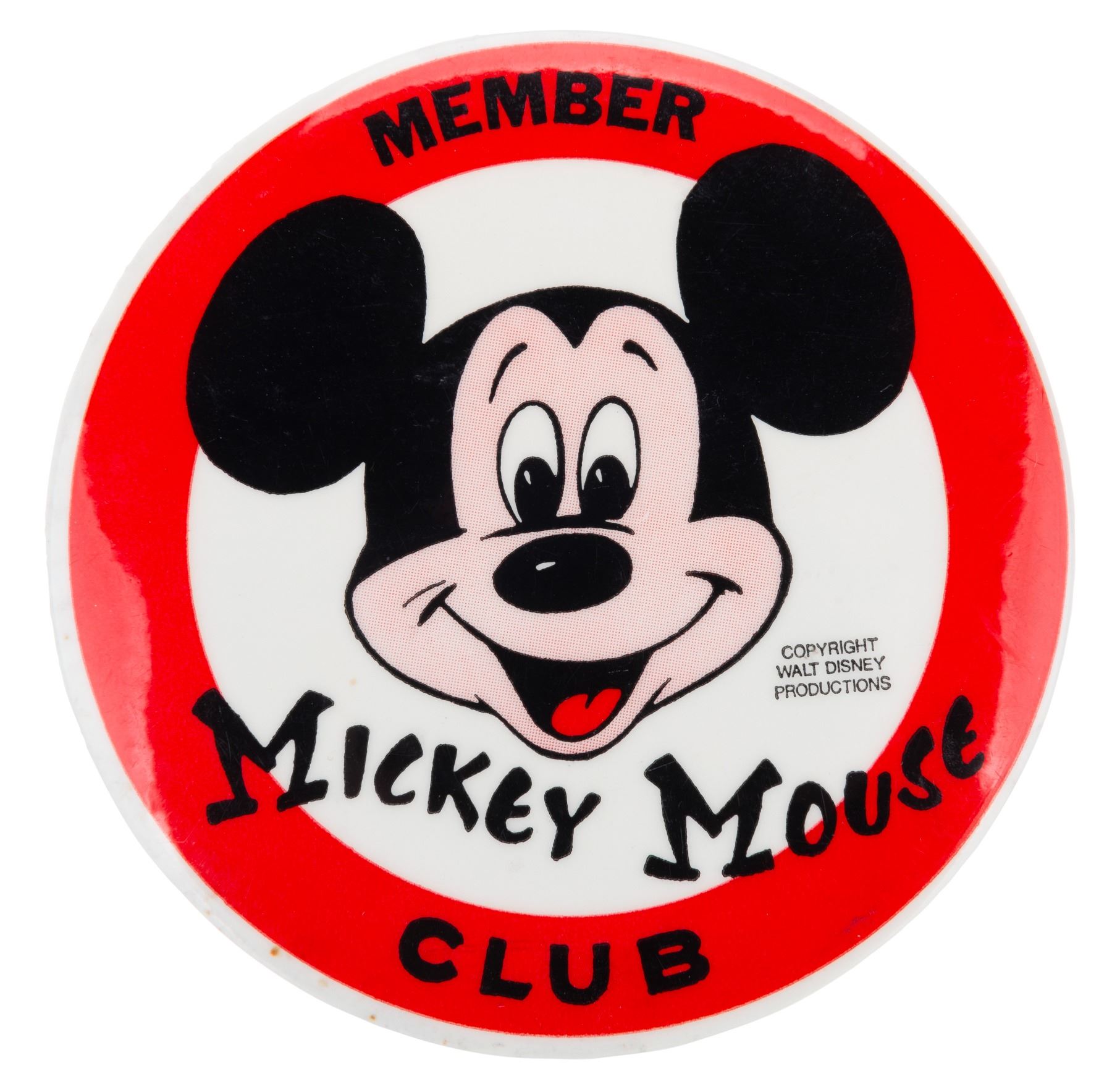(Disney, 1970s) A large Mickey Mouse Club Member pinback button. Measuring 3.5", the button is in good condition with surface scratches, small stains, and oxidation on the back.