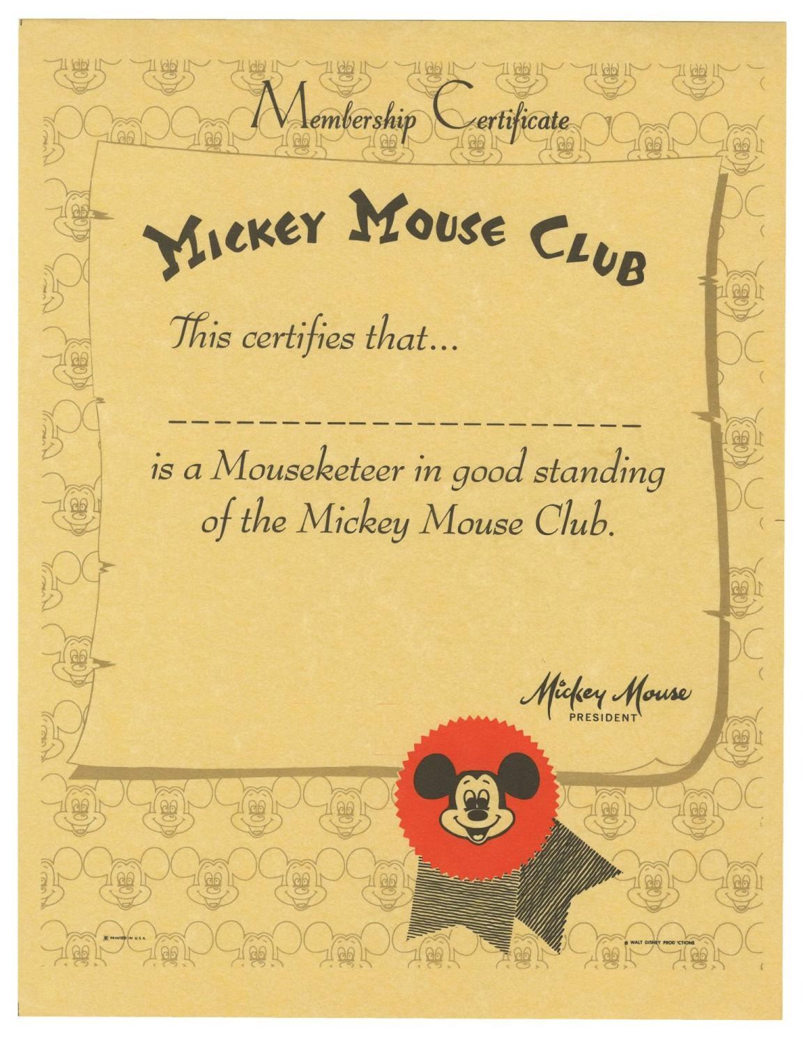 (Disney, 1950s) An original Membership Certificate from the Mickey Mouse Club. This document states that the member is "A Mouseketeer in good standing of the Mickey Mouse Club." The certificate has not been filled out and has a charming repeating Mickey pattern in the background. Measuring 8.5" x 11”, the certificate is in very good condition.