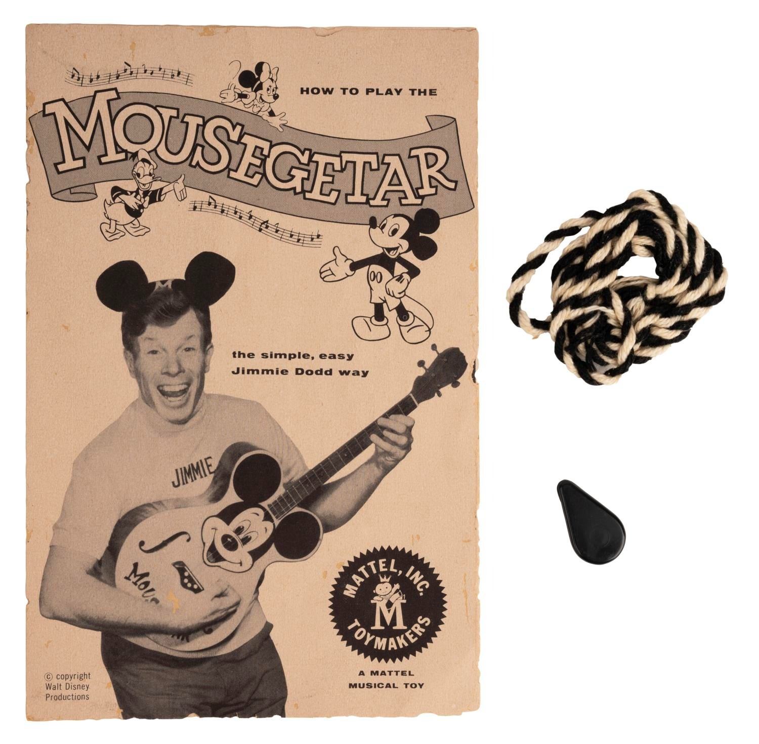 (Mattel, 1950s) An original Mousegetar toy reproducing the instrument Jimmy Dodd played on The Mickey Mouse Club. The plastic toy guitar comes with the original nylon strings, the rare instruction book, and a box with a colorful label. Measuring 8" x 23" x 2.5", the guitar is in very good condition, with spots of wear and image loss around the edge of the Mickey decal. The 8.5" x 5.5" instruction book is in good condition with wear from age and small chipping to edges, and the 9" x 24" box is in good condition with typical wear from age and handling.
