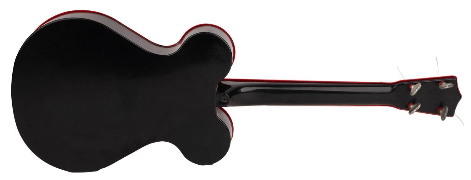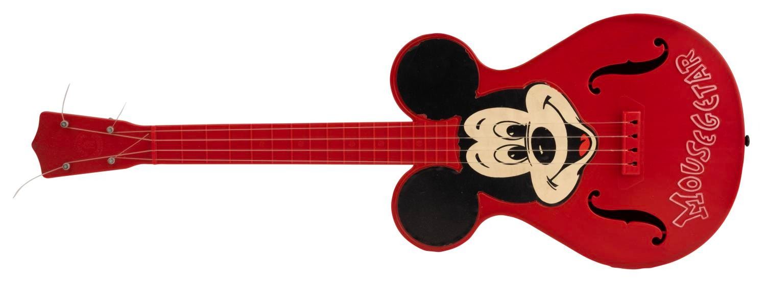 (Mattel, 1950s) An original Mousegetar toy reproducing the instrument Jimmy Dodd played on The Mickey Mouse Club. The plastic toy guitar comes with the original nylon strings, the rare instruction book, and a box with a colorful label. Measuring 8" x 23" x 2.5", the guitar is in very good condition, with spots of wear and image loss around the edge of the Mickey decal. The 8.5" x 5.5" instruction book is in good condition with wear from age and small chipping to edges, and the 9" x 24" box is in good condition with typical wear from age and handling.