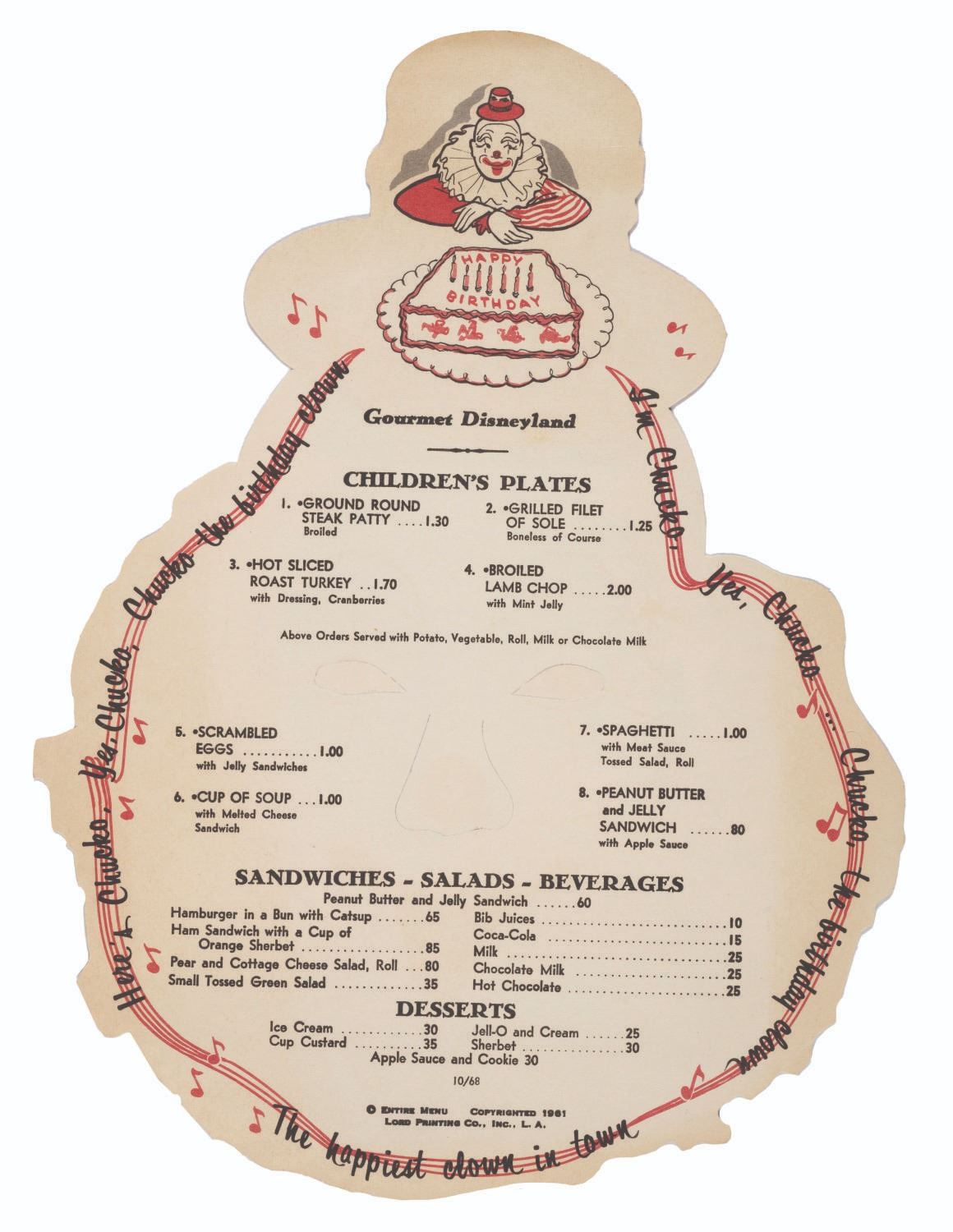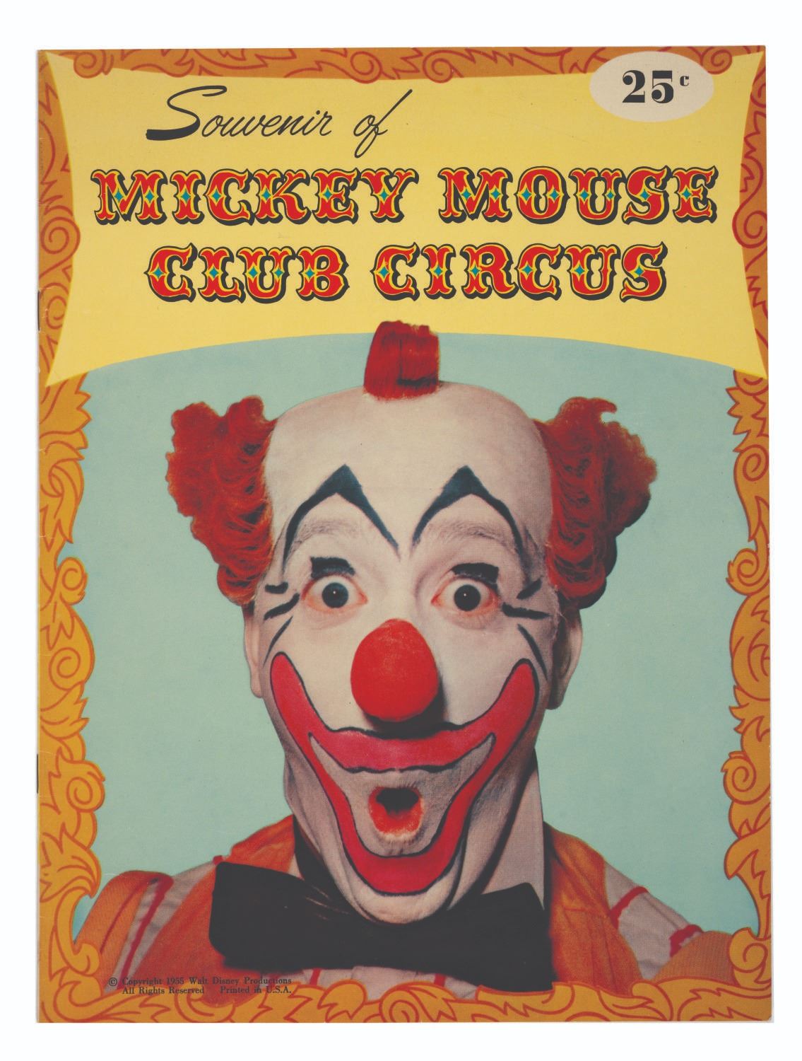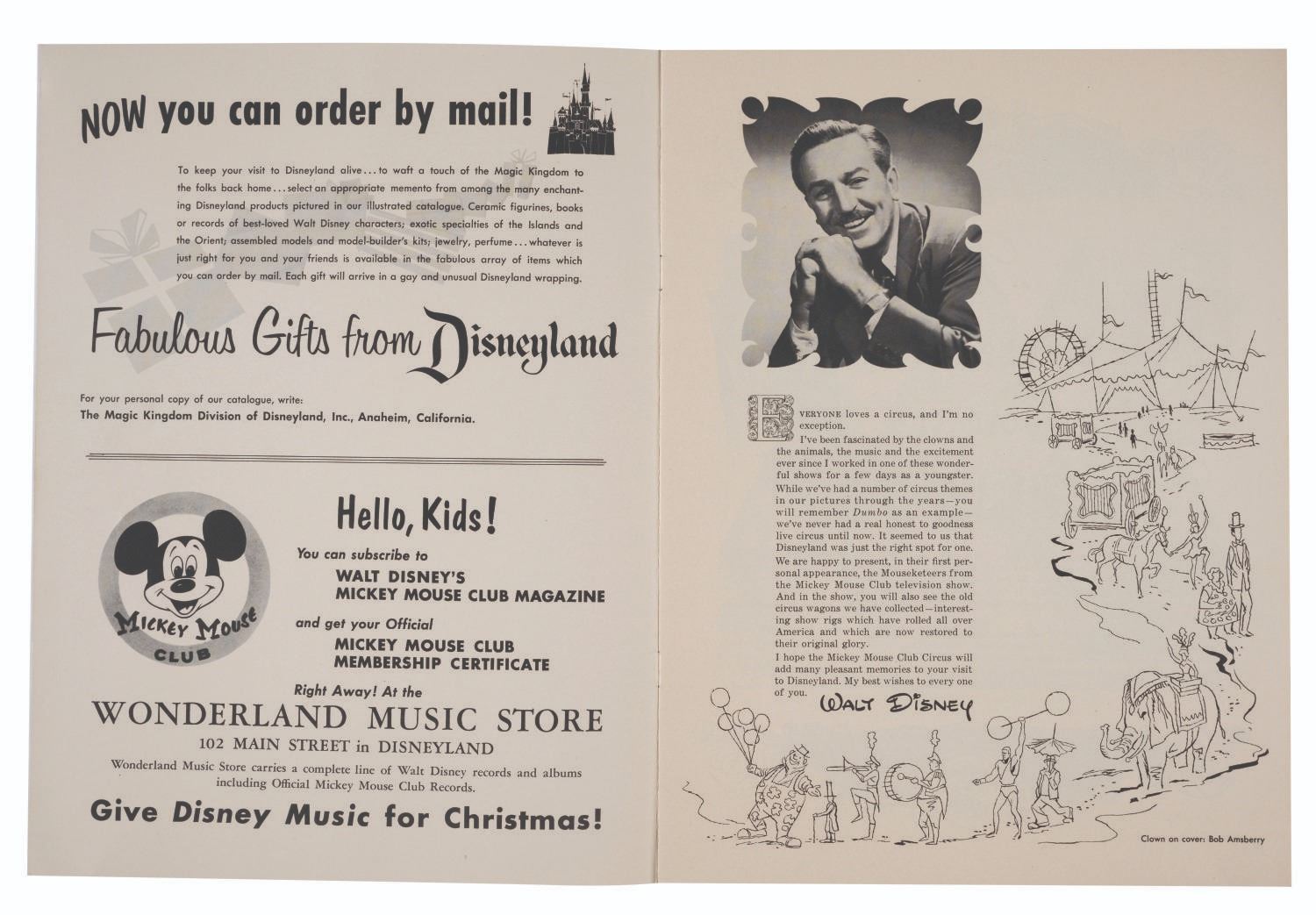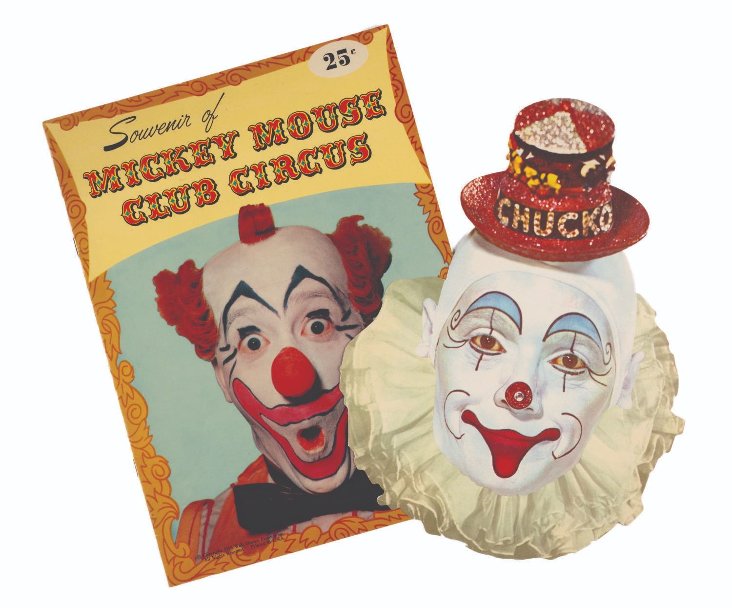 (Disneyland, 1955/1961) A "Souvenir of Mickey Mouse Club Circus" and Disneyland Hotel Gourmet Restaurants Menu. The souvenir program contains information on the Mouseketeer cast, antique wagons, show credits, with an introduction by the master showman Walt Disney. The menu is in the character of Chucko the Birthday Clown, a popular children's television host (from 1954-62) whose act was featured in the circus and later became affiliated with the Gourmet Restaurants. Measuring 9"x12" and 8.5"x11.5", the pieces are in very good condition with a few creases and edge wear to the program and unpunched menu.