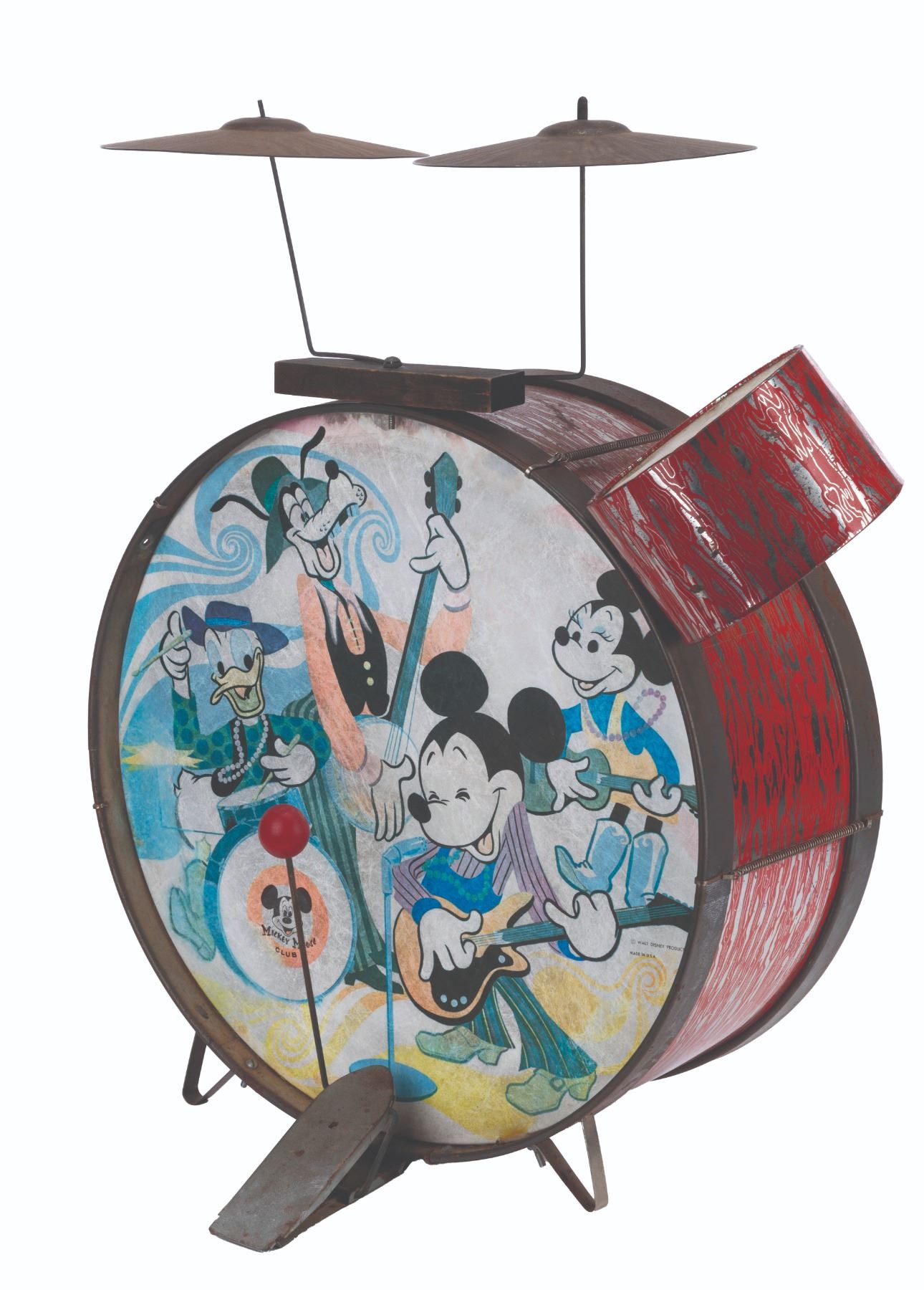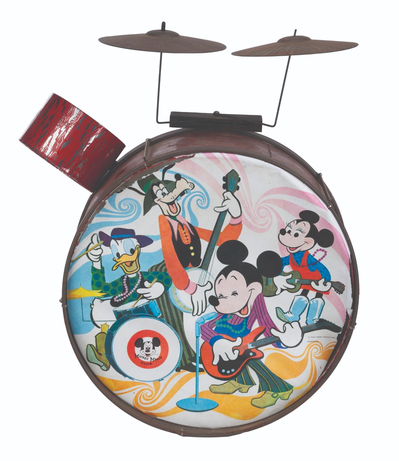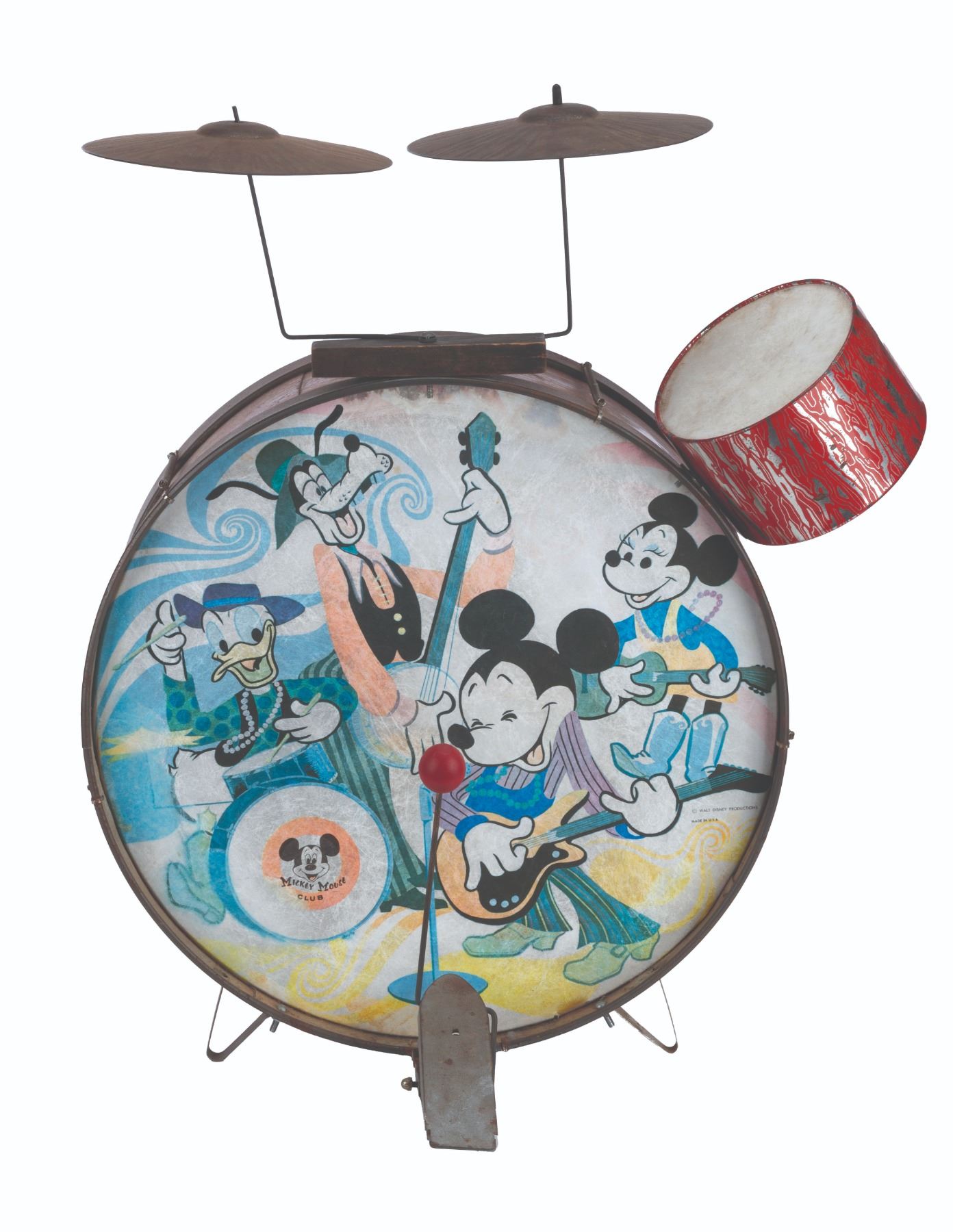 (Noble and Colley, 1950s) A “Mickey Mouse Club” toy drum set featuring Mickey, Minnie, Donald, and Goofy in retro outfits on the kick drum. Missing from the set is one small side drum. Measuring 19.5” x 27”, the drum set is in fair condition with heavy oxidation, discoloration from age, wear, and several tears on the drum head.