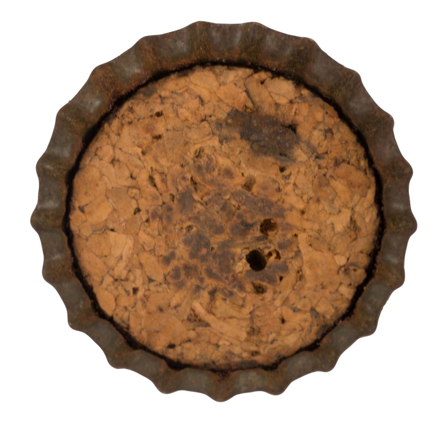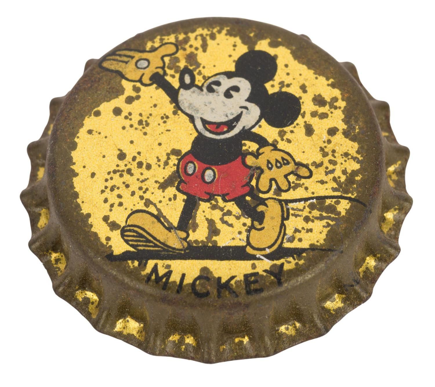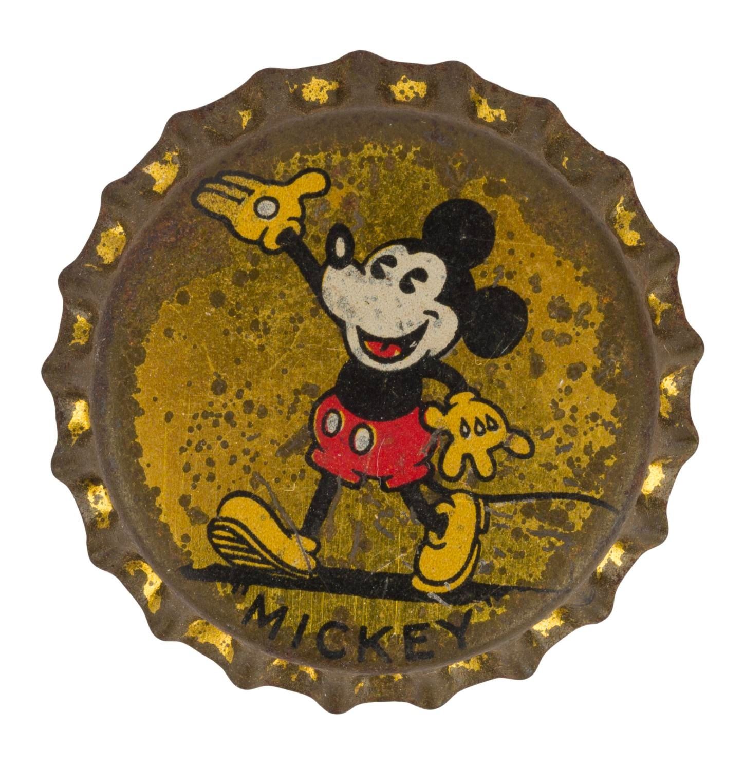 (Disney, 1930s) A Mickey Mouse Cork Soda Bottle Cap. Fluted and cork-backed caps such as this were premiums atop various brands of carbonated beverages like Mickey Mouse Pale Dry Ginger Ale by Ludford Fruit Products. Measuring 1.25" in diameter, the metallic, fluted cap is in good condition with signs of oxidation, scuffs, and wear.