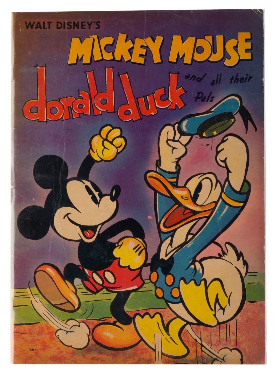 (Whitman, 1937) A Walt Disney’s Mickey Mouse, Donald Duck, and All Their Pals book. The 40-page book features stories of Disney characters including Mickey, the Three Little Pigs, and “Dippy the Goof,” an early name for Goofy. Measuring 11” x 14.5”, the book is in very good condition with light handling wear, pages off-white from age, and the two center pages separated from the staple but included.