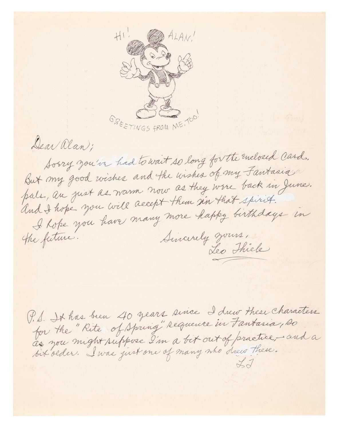 (Thiele, 1979) A letter featuring a Mickey Mouse drawing by "Fantasia" animator Leo Thiele, signed with a dedication to super-collector Alan Hylton. Accomplished in ink, with a character image size of 2" x 2.5" on an 8.5" x 11" piece of paper, the letter is in good condition with whiteout, imprints, and discoloration from age.