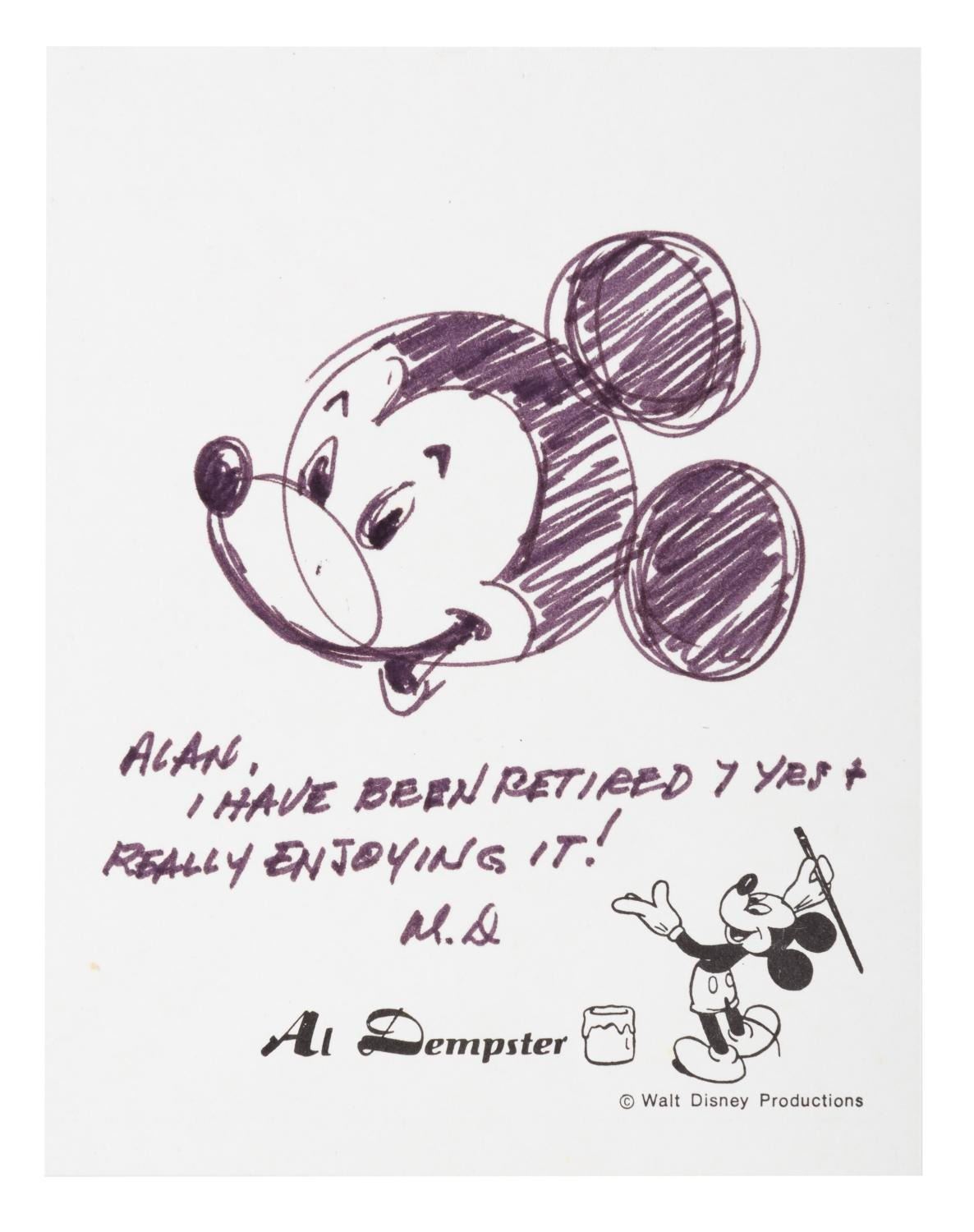 (Dempster, 1980s-90s) A marker drawing of Mickey Mouse on Walt Disney Productions stationery by background artist Al Dempster, signed with a dedication to Alan. Dempster is also known for his illustrations for Disney storybooks. Measuring 4.25” x 5.5”, the sketch is in very good condition, with typical light wear from age.