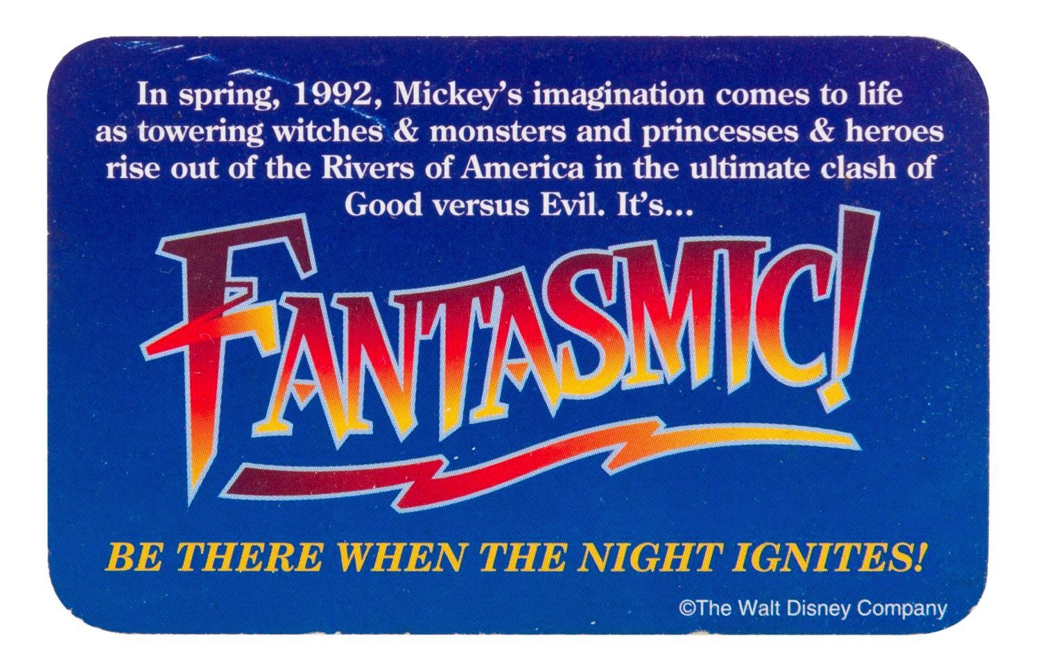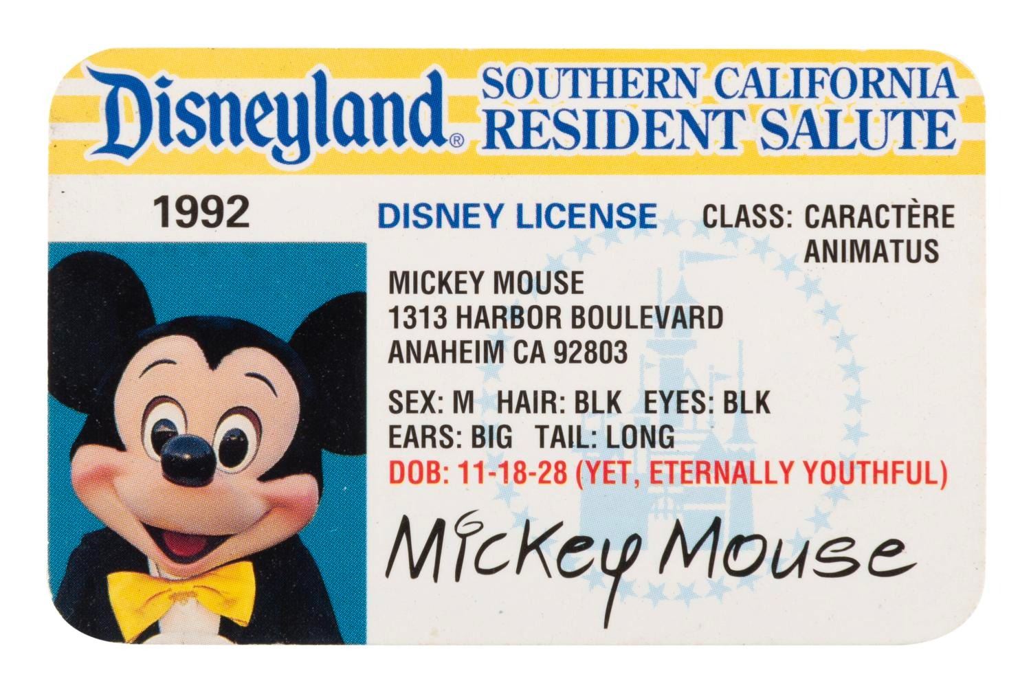 (Disneyland, 1992) A mock California State driver’s licence for Mickey Mouse with an advertisement for the opening of the Fantasmic! Show at Disneyland on the reverse. Measuring 3.5”x 2” the license in in good condition with surface wear and light creasing.