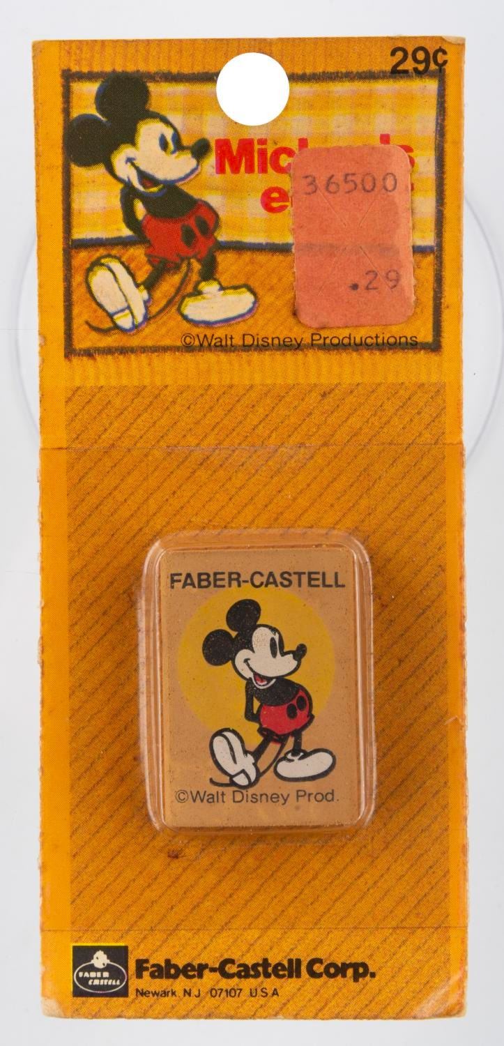 (Faber-Castell, 1970s-80s) A Mickey Mouse eraser by Faber-Castell sealed in the original packaging. Measuring 1" x 1.5" x 0.25", the eraser is in fine condition in the original packaging, in good condition with light corner and edge wear, and light discoloration from age.